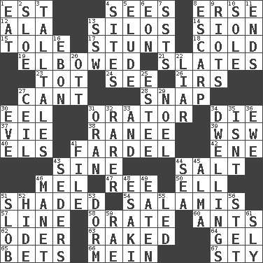 ACROSS 1. Eastern Standard Time (abbr.) 4. Perceives with the eye 8. Celtic language 12. In the manner of 13. Grain storage towers 14. The Jewish people; Israel 15. Lacquered or enameled metalware 17. Check the growth or development of 18. Chilled 19. Shoved, as through a crowd 21. Chalkboards 23. Small child 24. Observe 26. Big collection agency 27. Patter 28. Fastener 30. Snakelike fish 31. Speaker 34. Pass on 37. Compete 38. Indian princess (variant) 39. Compass dir. 40. Raised railways 41. Burden 42. Compass dir. 43. Trig term 44. Table seasoning 46. Cartoonist voice _ Blanc 47. To separate or throw off 50. Pipe bend 51. Cast a shadow over 54. Deli grouping 57. Actor's bit 58. Declaim 60. Pismires 62. Baltic tributary 63. Swept the length of 64. Set 65. Stakes 66. Chow _ 67. Filthy place DOWN 1. Consume 2. _ gin 3. Baron Munchausen's specialties 4. Settings 5. Dodge 6. Age 7. Fast planes 8. Fortification 9. Disturbances 10. Flatfish 11. Extremities 13. Compass dir. 16. Inky black, to poets 20. Baseball player Mel 22. One who doesn't tell the truth 25. First name in cosmetics 27. To provide with a ceiling 29. Christmas carol 30. First lady 31. NW Algerian seaport 32. More valued for its uncommonness 33. Plus 34. Homes 35. Is not 36. She-sheep 41. Do some clerical work 43. Spring feasts 44. Ocean 45. _ mater 46. French painter Edouard 48. 1973 Nobel Price Winner (Physics) Leo 49. Eroded 51. Messy guy 52. Flintstone garb 53. Dormintory (informal) 55. Directed 56. Proofreading order 59. Actress Charlotte 61. Wily
