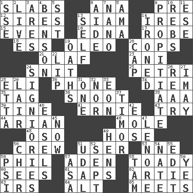 ACROSS 1. Broad, flat, thick pieces 6. Santa ___, CA 9. Before (prefix) 12. Fathers 13. Thailand, formerly 14. Angers 15. Happening 16. Pulitzer Prize-winning author Ferber 17. Loose flowing garment 18. Curvy letter 19. Butter sub 20. 911 reaches them 21. Norwegian king 23. Cuckoo 24. In a ____ (agitated or irritated) 25. _ dish (used to culture cells) 28. Biblical high priest 30. Give a jingle 34. South Vietnam president (1954) 35. Label 36. Snout, nose 38. Auto club (abbr.) 39. Prong on a fork 41. Bert's buddy 43. Attempt to accomplish something 44. Believer in; advocate of (suffix) 46. Undercover agent 48. Bear (Spanish) 49. Stockings 50. Group working together 51. One who makes use of a thing 53. Compass dir. 56. Silvers or Donahue 57. An important port of Yemen 58. Sycophant 60. Observes 61. Plant excrements 62. Nick name for Arthur 63. Big collection agency 64. Keyboard modifier key 65. Confronts DOWN 1. Compass dir. 2. Not recorded 3. Ancient Greek god of war 4. Gillaume's butler role 5. Fast jet (abbr.) 6. Assistant 7. Billionth: prefix 8. Housemaid (var.) 9. Conciliate 10. Confederate soldiers (slang) 11. Compass dir. 13. Automatically 14. Pressed 19. Expletives 20. Head covering 22. Mouth edge 24. Seigniories (variant) 26. Stern 27. "If ____ say so..." 28. Singer James 29. Den 31. Single 32. And not 33. Age 37. The easternmost of the Lesser Sundas 40. Artist's stands 42. Greek goddess of the dawn 45. Immediately 47. Poe poem 49. Coop moms 50. "Mermaids" star 51. Hereditary estate 52. Back-to-school mo. 54. Nathan's nickname 55. Prepare for publication 56. 23rd letter of the Greek alphabet 57. White ___ sheet 58. Scottish cap 59. Affirmative reply