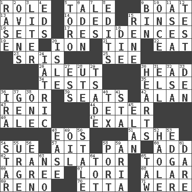 ACROSS 1. Hero or heavy, e.g. 5. Falsehood 9. Water vessel 13. Enthusiastic 14. Wrote a lyric poem 15. Wash lightly 16. Arranges properly for use 17. Homes 19. Compass dir. 20. Electrically charged atom 21. Metal container 22. Consume 23. Indian titles of respect 25. Observe 26. Native American of Southwest Alaska 30. Froth on beer 34. Trials 35. Otherwise 36. Russian composer Stravinsky 39. Theater features 42. Actor Alda or Thicke 43. Painter Guido (1575-1642) 44. Prevent from occurring 46. Actor Baldwin 47. Glorify 48. Greek goddess of the dawn 51. American tennis player Robert 54. Take to court 57. Small island 58. Baking dish 60. Increase 62. Interpreter 65. Ancient Roman robe 66. Match 67. Australian parrot (variant) 68. Having or resembling wings 69. Western Nevada city 70. Singer James 71. We are DOWN 1. Raze (variant) 2. Baking chambers 3. 61 cubic inches 4. Begley and Asner 5. "Corrida" creature 6. Arabian gulf 7. French article 8. Proofreads 9. Storage container 10. Single time 11. Toward the sea 12. Trial 15. French philosopher Descartes 18. Pass on 20. Capri or Wright 24. Of or pertaining to medicine 27. Double-curved letter 28. Shoshoni 29. Sadhe (variant) 30. Centers of feelings and intuitions 31. Pipe bend 32. White ___ sheet 33. Lair 36. Retirement account (abbr.) 37. Set 38. Single 40. John Ritter's dad 41. R.R. building 45. Enthusiasm 48. Comfort 49. Petroleum 50. Having lost freshness 52. White Person, in Hawaii 53. _ Allan Poe 54. Play the lead 55. Goad 56. Merit 58. Left side of a ship or aircraft 59. Roberta Peters solo 61. Have the gumption 63. Modern: prefix 64. Small child 65. The 23rd letter of the Hebrew alphabet