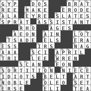 ACROSS 1. Flimflam 4. Two (Sp.) 7. Naughty child 11. Portuguese money of account (variant) 12. Cause to be 13. Wear away 14. In the manner of 15. Jane of fiction 16. Chalkboards 17. Small fatty European fish 19. Aide 21. 17th letter of the Greek alphabet 23. Eras 24. Period of immesurable duration 25. The 18th letter of the Arabic alphabet 26. Car dealer's back yard 29. Sadhe (variant) 30. Raised railways 31. Period 32. Curvy letter 33. Big collection agency 34. Tired old horse 35. American Automobile Association (abbr.) 36. _-fi 37. Showery time 40. Three (prefix) 41. Area sheltered from the wind 42. Songbird 43. Examine minutely or intensely 45. A really long time 46. Drawing lots 51. Sibling's daughter 55. Foolish or stupid persons 56. Waist strap 58. Tate display 59. Impressive in appearance 60. Butter sub 61. Arrange properly for use 62. Celtic language 63. Connecticut Ivy Leaguer 64. Afternoon social gathering DOWN 1. Pate de foie ____ 2. Sharp bark 3. Lightbulb-shaped fruit 4. 24 hours 5. Gumbo ingredient 6. Observes 7. Naughty children 8. Roll call or roster of names 9. Arabian gulf 10. Trial 12. Mode 13. Otherwise 16. Public displays of written messages 18. Length times width 20. Travel by water 22. Single 24. Slender Brazilian palm 25. Nest on high 26. Soviet premier 1918-24 27. Spoken 28. Label 29. Russian ruler of old 32. Ingest 33. Ancient Celtic tribe of eastern Britain 36. Narrow boards 37. Deep reverence 38. Right away 39. Painter Guido (1575-1642) 43. Fur scarf 44. Quote 46. Trig term 47. Scent 48. Teases 49. Mitch Miller's instrument 50. 1994 drama film starring Jodie Foster 52. Compass direction 53. Algonquian 54. Singer James 57. Luau accessory