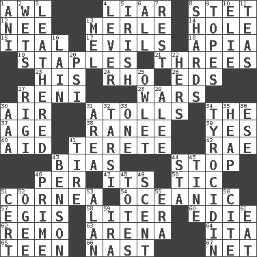ACROSS 1. Leather borer 4. One who doesn't tell the truth 8. Proofreading order 12. Born 13. Haggard of country music 14. Hollow 15. Slanted text style (abbr.) 17. Vices 18. Capital of Western Samoa 19. Paper fasteners 21. Trios 23. Part of HMS, perhaps 24. 17th letter of the Greek alphabet 26. Begley and Asner 27. Painter Guido (1575-1642) 28. Armed conflicts 30. Atmosphere 31. Ringlike coral islands and reefs 34. Definite Article 37. Ripen 38. Indian princess (variant) 39. Consenting reply 40. Help 41. Cylindrical with tapered ends 42. Actress Charlotte 43. Prejudice 44. Halt 46. For each 47. ___ a Wonderful Life 50. Nervous spasm 51. Pupil covering 54. Pertaining to the sea 57. Armor plate that protects the chest 58. 61 cubic inches 60. Singer Brickell 62. San ____ (Riviera town) 63. Sports stadium 64. Call ___ day 65. Adolescent 66. Political cartoonist Thomas 67. Fish or hair follower DOWN 1. Cuckoo 2. Moistens 3. Tough but pliablecoriaceous 4. Crowbar 5. From or relating to Ireland 6. 100% 7. Respite 8. Broken pieces 9. Drinks excessively 10. Writer Wiesel 11. Beverages made from leaves 13. Cartoonist voice _ Blanc 16. (Had) reclined 20. 23rd letter of the Greek alphabet 22. Possessive pronoun 25. A small or young owl 27. Swiss mountan, "Queen of the Mountains" 29. Toward shelter 30. Auto club (abbr.) 31. Length times width 32. Tarsus (plural) 33. Single 34. Polypeptide antibiotic 35. Pile 36. Compass dir. 41. Become fatigued 43. Gillaume's butler role 44. R.R. building 45. Prong on a fork 46. A-one 48. Lugs 49. Aroma 51. Certainty 52. Double curve, resembling the letter S 53. Actor Alda or Thicke 55. Period 56. Quote 59. Lyricist Gershwin 61. Consume