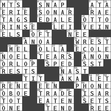 ACROSS 1. Mountains (abbr.) 4. Fastener 8. "One Day ___ Time" 11. 4th largest of the Great Lakes 13. Underwater navigation system 15. Actress Charlotte 16. Labels 17. Peak District village in England 18. Von Bismarck 19. Remove soap 21. Flowery wreath 22. Distinctive style or manner 23. Raised railways 24. Often (poetically) 27. Born 29. Small Philippine buffalo 30. Obtain by seizing forcibly or violently 34. Cartoonist voice _ Blanc 36. Spanish pot 39. Learning spot: Fr. 40. Christmas carol 41. Pulls into pieces 43. Soon (poet.) 44. Lowest deck of a ship 46. Hurried 47. Fast jet (abbr.) 48. Musical pauses 49. Political cartoonist Thomas 51. Teat (slang) 53. Alias (abbr.) 54. Allow 57. French philosopher Descartes 60. Car or cant ending 63. Give a jingle 65. Mitch Miller's instrument 66. Exchange 69. Austrian river, tributary to the Danube 70. Small child 71. Ingested 72. Arranges properly for use 73. Single 74. Watch over 75. Portuguese money of account (variant) DOWN 1. Distance measurement (Brit.) 2. Hang back 3. Attaches a signature 4. Compass dir. 5. Allow head to fall sleepily 6. Of or related to the anus 7. Light colored 8. Johnson of "Laugh-In" 9. Jacques of French films 10. A really long time 12. Double-curved letter 14. It's straight from the horse's mouth 18. Cloudy 20. Age 25. 12 inches 26. Falsehoods 28. She-sheep 29. One to whom something is allotted 31. Immeasurably long periods of time 32. Narrow, elongated depression 33. Nine, plus one 34. Greater amount 35. Snakelike fish 37. Infant locale 38. Sports stadium 40. Not either 42. Neighbor of Neb. 45. 23rd letter of the Greek alphabet 50. Plant excrement 52. Wig 54. Failure 55. Related on the mother's side 56. Laconic 57. Printing process, for short 58. Inky black, to poets 59. Musical sound 61. Part of Q.E.F. 62. Nathan's nickname 64. Part of HMS, perhaps 67. Lair 68. Conclusion