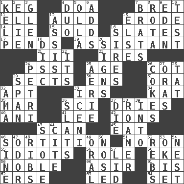 ACROSS 1. Cask 4. ___ good deed 7. Cy Young winner Saberhagen 11. Pipe bend 12. Old (Scot.) 13. Wear away 14. Whopper 15. Exchanged or delivered for money 16. Chalkboards 17. Depends 19. Helper 21. One more than two 23. Angers 24. Inconspicuous attention getter 25. Grow older 26. Small bed 29. Religious groups 30. Followers of ems 31. Mouth or opening 32. Fitting 33. Big collection agency 34. Krazy ___ of comics 35. Make imperfect 36. _-fi 37. Frees from moisture 40. Black tropical American cuckoo 41. Area sheltered from the wind 42. Charged atoms 43. Examine minutely or intensely 45. Consume 46. Decision 51. Person of subnormal intelligence 55. Foolish or stupid persons 56. Hero or heavy, e.g. 58. Make supply last 59. Having high moral qualities 60. SW Saudi Arabia district 61. Again 62. Celtic language 63. Directed 64. Put into a specified state DOWN 1. Seaweed 2. Writer Wiesel 3. Small, secluded valley 4. Superhero pair 5. Spanish pot 6. Sums up 7. Naughty children 8. Round or rotation of duties 9. Genesis locale 10. Trial 12. Aid 13. Otherwise 16. Founders of families 18. Flat circle 20. Signals 22. It is 24. _ dish (used to culture cells) 25. Nest on high 26. Popular sodas 27. Mouths or openings 28. Make lace 29. Connect, as a bridge 32. Housemaid (var.) 33. Ancient Celtic tribe of eastern Britain 36. Narrow boards 37. Expire 38. Wanderer 39. To the inside or interior of 43. Took without asking 44. Quote 46. Trig term 47. Aroma 48. Chest bones 49. Taken by mouth 50. Sense of smell 52. Confederate soldiers (slang) 53. Migrant worker of the '30s 54. A home for chicks 57. Hat (slang)