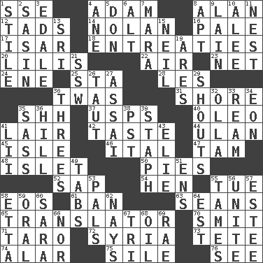 ACROSS 1. Compass dir. 4. First man 8. Actor Alda or Thicke 12. Small boys 14. Pitcher Ryan 16. Light colored 17. Austrian river, tributary to the Danube 18. Pleas 20. Ms. Damita and namesakes 22. Atmosphere 23. Fish or hair follower 24. Compass dir. 25. R.R. building 28. French article 30. It was, poetically 31. Dinah or Pauly 35. Quiet! 37. United States Postal Service (abbr.) 40. Butter sub 41. Den 42. Clothes sense 44. Uhlan (variant) 45. Capri or Wright 46. Slanted text style (abbr.) 47. Scottish cap 48. Small island 50. Sliced desserts 52. Plant excrement 54. Layer 55. Third day of the wk. 58. Greek goddess of the dawn 61. Prohibit 63. Actors Connery and Penn 65. Interpreter 70. Stricken, poetically 71. Edible starchy tuberous root 72. Damascus' land 73. Wig 74. Having or resembling wings 75. Drop; flow; fall 76. Observe DOWN 1. Vertical member of a panel or frame 2. Indian antelope 3. Peak District village in England 4. A saturated hydrocarbon 5. Spanish title 6. Keyboard modifier key 7. Hindu Mythology: god of death 8. Fitting 9. (Had) reclined 10. Toward shelter 11. Egg locale 13. _ Lanka 15. Famous astronaut Armstrong 19. Ancient Greek god of war 21. Compass dir. 26. Drawn tight 27. Slender Brazilian palm 29. Yells 30. Triplets 32. Spanish pot 33. 480, 500 or 516 sheets of paper 34. Age 35. Backtalk 36. Land elevation 38. Pacific Standard Time (abbr.) 39. Staphylococcus 41. Cards in a Roman deck? 43. Writer Wiesel 49. Bar bills 51. Followers of ems 53. Friends 55. Softens 56. Join together 57. First name in cosmetics 58. Singer James 59. Of the mouth 60. "Two Mules for Sister ____" 62. Negative votes 64. Eastern Standard Time (abbr.) 66. And not 67. Three (prefix) 68. Lubricate 69. Actress Charlotte