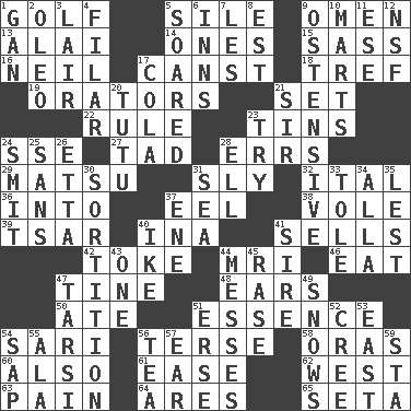 ACROSS 1. _ course 5. Drop; flow; fall 9. Sign of something about to happen 13. Mountain range southwest of Kyrgyzstan 14. Washington bills 15. Backtalk 16. Famous astronaut Armstrong 17. 2nd pers. sing. pres. of can (arch.) 18. Not kosher 19. Speakers 21. Put into a specified state 22. General guideline 23. Metal containers 24. Compass dir. 27. Bit 28. Blunders 29. Taiwanese island in East China Sea 31. Wily 32. Slanted text style (abbr.) 36. To the inside or interior of 37. Snakelike fish 38. Short-tailed, large-bodied rat 39. Russian ruler of old 40. _ tizzy (2 wds.) 41. Makes a sale 42. Casino tip 44. Medical imaging device (abbr.) 46. Ingest 47. Prong on a fork 48. Hearing organs 50. Had dinner 51. Center 54. Indian skirt 56. Laconic 58. Mouths or openings 60. In addition 61. Relaxation 62. Compass direction 63. Ache 64. Ancient Greek god of war 65. Stalk of a moss capsule DOWN 1. Separate the seeds from cotton 2. Butter sub 3. Den 4. Of or pertaining to a thread or threads 5. Flew 6. Restaurants 7. French article 8. Eastern Standard Time (abbr.) 9. Clearly or manifestly demonstrative 10. Shops 11. Compass dir. 12. Science/research agcy. 17. Root beer relative 20. Ballerina skirt 21. Title for a knight 23. Attempt to accomplish something 24. Stricken, poetically 25. Without 26. Singer James 28. Pipe bend 30. Making a chance decision by using lots 31. Ocean 33. Lacquered or enameled metalware 34. Silent film actress Nazimova 35. For fear that 37. Compass dir. 40. D.D.E's nickname 41. Title for a man of rank and authority 43. Single 44. Makes clutter 45. Raze (variant) 47. Tarsus (plural) 49. Frozen precipitation (plural) 51. Celtic language 52. Algonquian 53. 90 degrees 54. Plant excrement 55. In the manner of 56. Beverage made from leaves 57. Hearing organ 59. R.R. building