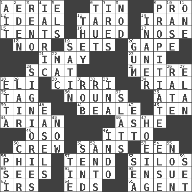 ACROSS 1. Nest on high 6. Shallow baking pan 9. Adept person 12. Standard of perfection 13. Pacific island yam 14. SW Asia republic 15. Portable shelters 16. Took on color 17. Olfactory organ 18. Not either 19. Puts into a specified state 20. Yawn 21. "If ____ say so..." 23. Single; one (prefix) 24. Jazz singing style 25. Distance measurement (Brit.) 28. Connecticut Ivy Leaguer 30. High-altitude cloud 34. Monetary unit of Yemen 35. Label 36. Parts of speech 38. "One Day ___ Time" 39. Prong on a fork 41. Calif. Air Force Base 43. "___ Little Indians" 44. Believer in; advocate of (suffix) 46. American tennis player Robert 48. Bear (Spanish) 49. "Tell ____ the Marines!" 50. Group working together 51. Without 53. Car or cant ending 56. Silvers or Donahue 57. Be inclined (to) 58. Grain storage towers 60. Observes 61. To the inside or interior of 62. Follow as a consequence or result 63. Big collection agency 64. Begley and Asner 65. Rep DOWN 1. Small island 2. Locale of original sin 3. Western Nevada city 4. Of or pertaining to medicine 5. Raised railways 6. Drawn tight 7. Angers 8. Lower and raise head in agreement 9. Appease 10. Raze (variant) 11. Single 13. Those things 14. More lacking in sense or substance 19. Smooth fabric 20. Chewing product 22. Apple computer (short form) 24. Seigniories (variant) 26. Pace 27. Liveliness 28. Singer James 29. Den 31. Director Reiner 32. Regret 33. _ tizzy (2 wds.) 37. Narrow boards 40. Artist's stands 42. Eastern Standard Time (abbr.) 45. At this time 47. Cultivating 49. Southeast Asian peninsula 50. "Mermaids" star 51. Transmit 52. Pismires 54. Otherwise 55. Part of speech 56. Air pressure measure (abbr.) 57. Make a knot 58. Ocean 59. Put into a specified state