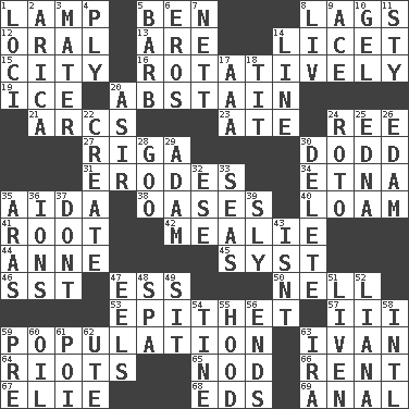 ACROSS 1. Desk light 5. Benjamin's nick name 8. Falls behind 12. Relating to the mouth 13. "We ___ not amused" (Victoria) 14. It is permitted: Lat. 15. Municipality 16. Happening in regular succession 19. Frozen water 20. Refrain by choice 21. Arches 23. Had dinner 24. Portuguese money of account (variant) 27. Port city in Latvia 30. Texas town _ City 31. Eats (away) 34. Inactive volcano in Sicily 35. Opera by Verdi 38. Fertile tracts in a desert 40. Rich soil 41. Carrot, for example 42. Ear of corn 44. Singer Murray 45. System (abbr.) 46. Fast jet (abbr.) 47. Double-curved letter 50. 1994 drama film starring Jodie Foster 53. Curse 57. One more than two 59. Census information 63. _ the terrible 64. Disturbances 65. Allow head to fall sleepily 66. Monthly bill 67. Writer Wiesel 68. Begley and Asner 69. Of or related to the anus DOWN 1. Event scenes 2. N. Chile seaport 3. Mother 4. Strand of rope, yarn or thread 5. Sharp remark 6. Greek god of love 7. Remaining after all deductions 8. 54 in ancient Rome 9. Adept person 10. Set 11. Filthy place 14. Actor's bit 17. Auto club (abbr.) 18. Teat (slang) 20. SW Saudi Arabia district 22. Cause to be 24. Printing process, for short 25. Pulitzer Prize-winning author Ferber 26. Dutch treat 28. Thick or sticky substance 29. First of billions? 30. Erase 32. Compass dir. 33. Oceans 35. Caspian sea tributary 36. Charged atoms 37. Do not 39. Insidious 43. Is not 47. Snakelike fish 48. Health resort 49. Be seated 51. Make or become more lively 52. Climbing, woody, usually tropical vines 54. Prong on a fork 55. Parka part 56. Conclusions 58. International (abbr.) 59. Before (prefix) 60. Lubricate 61. Luau course 62. Shoshoni 63. Retirement account (abbr.)