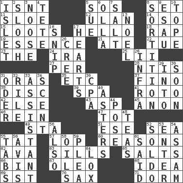 ACROSS 1. Is not 5. Distress signal 8. Put into a specified state 11. _ gin 12. Uhlan (variant) 14. Bear (Spanish) 15. Plunders 17. Phone greeting 18. Strike 19. Substance 21. Had dinner 22. Third day of the wk. 23. Definite Article 24. Lyricist Gershwin 25. Cards in a Roman deck? 27. For each 28. Nuclear Threat Initiatives 31. Mouths or openings 35. And so on (abbr.) 37. A pale, very dry sherry 38. Plate 39. Health resort 41. Printing process, for short 42. Otherwise 43. Viper 45. At once, immediately (arch.) 46. It's straight from the horse's mouth 47. Small child 49. R.R. building 51. Compass dir. 52. Ocean 55. Make lace 57. Trim (branches) 60. Thinks logically 62. Actress Gardner 63. Beverly of Met fame 65. Table seasonings 66. Storage container 67. Margarine 68. It may be bright or harebrained 69. Fast jet (abbr.) 70. Saxophone 71. Dormintory (informal) DOWN 1. Small island 2. Splash clumsily 3. Trap for birds or small mammals 4. False hair 5. Institute legal proceedings 6. Spanish pot 7. Table seasoning 8. Determination 9. Son of Isaac 10. Drink excessively 13. Christmas carol 16. Sever or remove by pinching or nipping 17. Centers 20. Algonquian 26. Kind of red light 29. To the inside or interior of 30. Within a short period 31. Baltic tributary 32. Cause heat under the collar 33. Aide 34. Aroma 36. Numbers guy (abbr.) 40. Michaelmas daisies 44. Introduce or present, as a question 48. Beverages made from leaves 50. In addition 52. Twentieth part of a lira 53. Keyboard key 54. Indian state 55. Bar bills 56. Deliberation 58. Petroleums 59. Entreaty 61. Stated 64. Brine-cured salmon