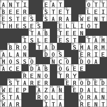 ACROSS 1. Opposed to 5. Ingest 8. Baseball player Mel 11. Fermented drink made from hops 12. Proofreading order 14. Flowery wreath 15. _____ Park, CO 17. "Two Mules for Sister ____" 18. Left 19. College papers 21. American author Paul (1891-1958) 23. Bar bill 25. Adolescent 26. Capri or Wright 27. Eastern Standard Time (abbr.) 28. Scottish cap 31. Sis' sibling 33. Small boy 35. Excessive but superficial compliments 37. ____ Jay Lerner 38. Two (Sp.) 40. 4th largest of the Great Lakes 41. With motion or animation 43. Non-commissioned officer (abbr.) 45. ___ good deed 46. Adept person 47. Small moist lump or mass 50. Double curve, resembling the letter S 52. Western Nevada city 53. Attempt 54. A viewer who gazes fixedly 56. Worn away 61. Shed a tear 62. Muslim summons to prayer 65. Peak District village in England 66. R.R. building 67. Hero or heavy, e.g. 68. NW Algerian seaport 69. Armed conflict 70. Call ___ day 71. Monthly bill DOWN 1. Collude with 2. Tender 3. False hair 4. Angers 5. Curvy letter 6. "One Day ___ Time" 7. Cylindrical with tapered ends 8. Margarine 9. Portable shelter 10. Teat (slang) 13. Lies 16. Puts into a specified state 18. Victory 20. Table seasoning 22. Allows 24. Necklace unit 26. Charged atoms 28. Edible starchy tuberous root 29. Operatic vocal solo 30. Madame (abbr.) 31. Group of countries in special alliance 32. Raze (variant) 34. Spanish title 36. Ancient Persian 37. Nanny (var.) 39. Highlander 42. River in Europe 44. Legendary monster 48. Approach 49. Russian wolfhound 51. Jane of fiction 52. Reproach for some lapse or misdeed 54. Bristle 55. Rend 57. Aroma 58. Have the gumption 59. Enthusiasm 60. Gouge 61. Compass dir. 63. Keyboard modifier key 64. Teachers' org.