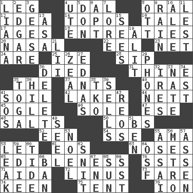 ACROSS 1. Part of a journey 4. Hereditary estate 8. Of the mouth 12. The main thing one is thinking about 14. Traditional theme or motif 16. Story 17. Eons 18. Pleas 20. Relating to the nose 22. Snakelike fish 23. Fish or hair follower 24. "We ___ not amused" (Victoria) 25. Ending with capital 28. Small drink 30. Passed on 31. One or ones belonging to thee 35. Definite Article 37. Pismires 40. Mouths or openings 41. Earth 42. Member of a famous L.A. basketball team 44. Remaining after all deductions 45. Stare 46. Not divided or shared with others 47. Compass dir. 48. Table seasonings 50. Tennis shots 52. Car or cant ending 54. Compass dir. 55. Housemaid (var.) 58. Allow 61. Greek goddess of the dawn 63. Olfactory organs 65. The property of being fit to eat 70. Fast planes 71. Opera by Verdi 72. "_ and Lucy" (Charlie Brown theme song) 73. Conductor's collection 74. Peachy ____! 75. Portable shelter 76. Electrically charged atom DOWN 1. Climbing, woody, usually tropical vines 2. _ Allan Poe 3. Honkers 4. Shoshoni 5. Spanish title 6. Fitting 7. Old wives' tales, e.g. 8. Baseball player Mel 9. Precipitation 10. Toward shelter 11. For fear that 13. White ___ sheet 15. Perceives with the eye 19. Set down 21. Cards in a Roman deck? 26. Ardor 27. Ferber et al. 29. Gives a jingle 30. Keyboard key 32. Angers 33. Nathan's nickname 34. Eastern Standard Time (abbr.) 35. Ancient Roman robe 36. Land elevation 38. Ring climax 39. Exchanges for money 41. Distress signal 43. Vintage cars 49. Sew up the eyelids of hawks and falcons 51. Benjamin's nick name 53. Christmas carol 55. Slender Brazilian palm 56. Paris' subway 57. NE Netherlands city 58. Path through which fluid escapes 59. Singer Brickell 60. Periodic rise and fall of the sea level 62. In a ____ (agitated or irritated) 64. Order of Saint Francis (abbr.) 66. Prohibit 67. Compass dir. 68. Player for Phoenix 69. Fast jet (abbr.)