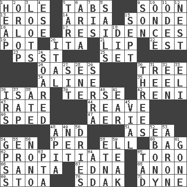 ACROSS 1. Hollow 5. Bar bills 9. Within a short period 13. Greek god of love 14. Operatic vocal solo 15. Something which is sent 16. Medicinal plant 17. Homes 19. Cooking vessel 20. Call ___ day 21. Mouth edge 22. Eastern Standard Time (abbr.) 23. Inconspicuous attention getter 25. Arrange properly for use 26. Fertile tracts in a desert 30. Family _ (genealogy) 34. Place in a line 35. Person who is morally reprehensible 36. Austrian river, tributary to the Danube 39. Laconic 42. Painter Guido (1575-1642) 43. Assign a rank or rating to 44. Break or tear apart 46. Moved rapidly 47. Nest on high 48. Plus 51. Toward the sea 54. Commissioned military rank (abbr.) 57. For each 58. Pipe bend 60. Paper or plastic container 62. Appease 65. "Corrida" creature 66. Before Barbara or Clara 67. Pulitzer Prize-winning author Ferber 68. At once, immediately (arch.) 69. Portico 70. Neighbor of Neb. 71. Centimeter-gram-second unit of force DOWN 1. Pile 2. Fourth or lowest deck 3. Plunders 4. Compass dir. 5. Small pie 6. Length times width 7. Twice 8. Moves on water 9. Boy, to dad 10. Single time 11. Lyric poems 12. A home for chicks 15. Back-to-school mo. 18. Pass on 20. Slanted text style (abbr.) 24. Flew 27. Be seated 28. Compass dir. 29. Spanish missionary in California 30. Triplets 31. To separate or throw off 32. Car or cant ending 33. Biblical high priest 36. Big collection agency 37. Plant excrement 38. Had dinner 40. Perceive with the eye 41. Hearing organ 45. Small bottle 48. Capital of Western Samoa 49. Fish or hair follower 50. Frees from moisture 52. Black 53. Composer Copland 54. Global Positioning Systems (abbr.) 55. Part of Q.E.F. 56. Words to Nanette 58. Inactive volcano in Sicily 59. Path through which fluid escapes 61. Went 63. Parent Teacher Assoc. 64. Find the sum of 65. Small amount or degree