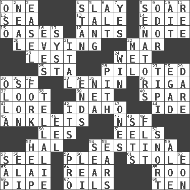 ACROSS 1. Single 4. Kill 8. Fly high 12. Ocean 13. Lie 14. Singer Brickell 15. Fertile tracts in a desert 18. Pismires 19. Make mention of 20. Imposing or collecting, as a tax 22. Make imperfect 23. For fear that 24. Soggy 25. R.R. building 26. Manned the helm 30. Order of Saint Francis (abbr.) 33. Soviet premier 1918-24 36. Port city in Latvia 37. Spoils 39. Fish or hair follower 40. Coast Guard woman 41. Old wives' tales, e.g. 42. Potato state 44. Binary compound 45. Short socks 47. Science/research agcy. 50. French article 51. Snakelike fish 53. Actor Linden 54. French poetic form 57. Sew up the eyelids of hawks and falcons 59. Entreaty 61. Fur scarf 63. Jai ____ 64. Hitchcock's "____ Window" 65. Friend of Pooh 66. Corncob 67. Lubricates 68. "___ Little Indians" DOWN 1. Bear (Spanish) 2. Be tempered by heat 3. Artist's stand 4. Comedian Laurel of Laurel & Hardy 5. Long (Scottish) 6. The first octave above the treble staff 7. It is so 8. Elected representatives 9. Aroma 10. Small island 11. Portuguese money of account (variant) 16. Nights before holidays 17. System (abbr.) 21. Slanted text style (abbr.) 22. Cartoonist voice _ Blanc 24. Acquire through effort 26. Heart or essence 27. Native american tent (variation) 28. Mild oath 29. Have the gumption 30. Rounded earthenware pot or jar 31. Within a short period 32. Tined utensil 34. Conclusions 35. Teachers' org. 38. Copy Pinocchio 42. ___ a Wonderful Life 43. Washington bills 46. Snakelike fish 48. Puts into a specified state 49. Secret move to avoid paying debts 52. Derisive sound 53. Pile 54. Lick closed 55. Hearing organs 56. Medicinal plant 57. Plant excrement 58. Biblical high priest 59. Adept person 60. Flowery wreath 62. A really long time