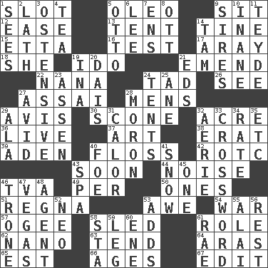 ACROSS 1. Notch 5. Butter sub 9. Be seated 12. Relaxation 13. Portable shelter 14. Prong on a fork 15. Singer James 16. Trial 17. Like ___ of sunshine 18. A female animal or person 19. Wedding promise 21. Make improvements or corrections to 22. Grandmother 24. Small boy 26. Observe 27. Slender Brazilian palm 28. Not women's 29. Deliberation 30. Biscuitlike quick bread 32. 43,560 square feet 36. Moving, as bait 37. Nonscientific branch of learning 38. Part of Q.E.F. 39. An important port of Yemen 40. Soft thread for cleaning between teeth 42. College mil. group 43. Within a short period 44. Annoying sound 46. Federal power corp. 49. For each 50. Washington bills 51. Rain (Swedish) 53. Deep reverence 54. Armed conflict 57. Double curve, resembling the letter S 58. Downhill vehicle 61. Hero or heavy, e.g. 62. Billionth: prefix 63. Look after 64. Caspian sea tributary 65. Eastern Standard Time (abbr.) 66. Eras 67. Prepare for publication DOWN 1. Observes 2. Thin strip of wood or metal 3. Clearly or manifestly demonstrative 4. Beverage made from leaves 5. "Beetle Bailey" pooch 6. Area sheltered from the wind 7. Followers of ems 8. Baseball player Mel 9. Fathers 10. Silly 11. Miss Universe 1986, Barbara Palacios _ 14. Scottish cap 19. _ tizzy (2 wds.) 20. Raised platform 21. Begley and Asner 23. NE Netherlands city 24. Portable shelters 25. One (Scot) 27. Enthusiastic 28. Person of subnormal intelligence 29. Insect wing 31. Bodily heat indicating an inflammation 32. Nest on high 33. What you're doing now 34. Assign a rank or rating to 35. And so on (abbr.) 40. Enemy 41. Overwhelm 43. Health resort 45. Single 46. Marketplace scale 47. Viva Las _ 48. Rep 52. Modern: prefix 53. Sums up 55. Mountain range southwest of Kyrgyzstan 56. Repose 58. R.R. building 59. Part of a journey 60. Compass dir. 61. Actress Charlotte