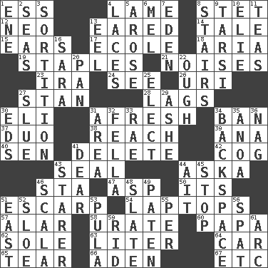 ACROSS 1. Double-curved letter 4. Unable to walk 8. Proofreading order 12. Modern: prefix 13. Having ears or earlike features 14. Story 15. Hearing organs 17. Learning spot: Fr. 18. Roberta Peters solo 19. Paper fasteners 21. Annoying sounds 23. Lyricist Gershwin 24. Perceive with the eye 26. RI univ. 27. Comedian Laurel of Laurel & Hardy 28. Straggles 30. Connecticut Ivy Leaguer 31. Anew 34. Prohibit 37. Superhero pair 38. Arrive at 39. Santa ___, CA 40. Elected rep. 41. Keyboard key 42. Gear tooth 43. Lick closed 44. "____ silly question..." 46. R.R. building 47. Viper 50. ___ a Wonderful Life 51. Fortification 54. Portable computers 57. Having or resembling wings 58. A salt of uric acid 60. Dad 62. Flatfish 63. 61 cubic inches 64. Auto 65. Rend 66. An important port of Yemen 67. And so on (abbr.) DOWN 1. Compass dir. 2. Oceans 3. Conclusion 4. Shoestrings 5. Came up 6. Cartoonist voice _ Blanc 7. Paradise 8. Flight of steps 9. Tarsus (plural) 10. Writer Wiesel 11. Afternoon social gatherings 13. Snakelike fish 16. "Two Mules for Sister ____" 20. Baking dish 22. Ending for "Through" and "Enough" 25. Voters do this 27. Change direction abruptly 29. American tennis player Robert 30. Begley and Asner 31. Type of rug 32. Man or boy (slang) 33. Actress Charlotte 34. Keyboard key 35. Small Philippine buffalo 36. Tired old horse 41. Letter starter 43. A viewer who gazes fixedly 44. Small island 45. Constrict 46. Any of the three canals of the cochlea 48. Schedule 49. Eucharist need 51. 90 degrees 52. A type of plum 53. Monetary unit of Botswana 55. For each 56. Argument over a trivial matter 59. To free from 61. Curve