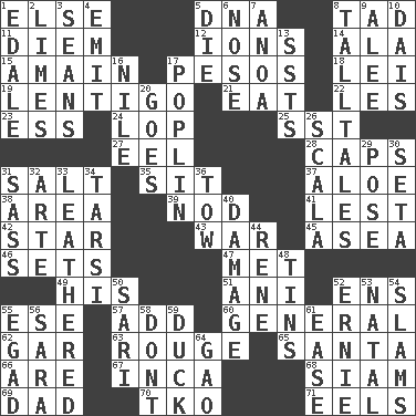 ACROSS 1. Otherwise 5. Heredity factor (abbr.) 8. Small boy 11. South Vietnam president (1954) 12. Charged particles 14. Insect wing 15. With great haste 17. Mexican monetary units 18. Luau accessory 19. Small, flat, pigmented spot on the skin 21. Ingest 22. French article 23. Curvy letter 24. Chop off 25. Fast jet (abbr.) 27. Snakelike fish 28. Balmoral and tarboosh 31. Table seasoning 35. Be seated 37. Medicinal plant 38. Length times width 39. Lower and raise head in agreement 41. For fear that 42. Play the lead 43. Armed conflict 45. Toward the sea 46. Arranges properly for use 47. Was introduced to 49. Part of HMS, perhaps 51. Black tropical American cuckoo 52. Followers of ems 55. Compass dir. 57. Increase 60. Commissioned military rank 62. Slender fish 63. Makeup applied to the cheeks 65. Before Barbara or Clara 66. "We ___ not amused" (Victoria) 67. South American Indian 68. Thailand, formerly 69. June honoree 70. Ring climax 71. Snakelike fish DOWN 1. Peak District village in England 2. Citrus fruits 3. Seines 4. Give off 5. Pass on 6. Sense of smell 7. Small Philippine buffalo 8. Baron Munchausen's specialties 9. Toward shelter 10. Raised platform 13. Fast planes 16. Mediterranean tributary 17. Cotton for raincoats, e.g. 20. Leaves 26. Any of the three canals of the cochlea 29. Airs 30. Bristle 31. Backtalk 32. Johnson of "Laugh-In" 33. Tough but pliablecoriaceous 34. Tarsus (plural) 36. Pull behind 40. Break 44. French philosopher Descartes 48. Airtight sealed metal containers 50. Indian skirt 52. Bert's buddy 53. Brizilian seaport 54. Criticizes harshly 55. Mild oath 56. "Two Mules for Sister ____" 58. Do not 59. Evade 61. Comfort 64. E Mali city