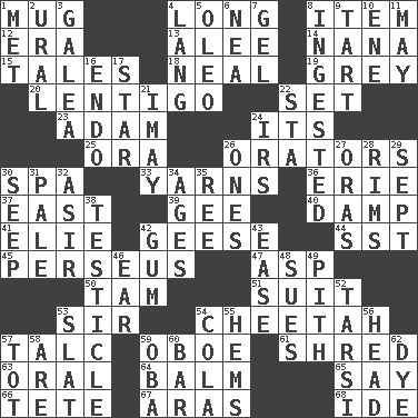 ACROSS 1. Large cup 4. Yearn 8. A whole individual unit 12. Epoch 13. Toward shelter 14. Nanny 15. Lies 18. Anneal 19. Jennifer or Joel 20. Small, flat, pigmented spot on the skin 22. Arrange properly for use 23. First of billions? 24. ___ a Wonderful Life 25. Mouth or opening 26. Speakers 30. Health resort 33. Entertaining tales 36. 4th largest of the Great Lakes 37. Compass direction 39. Turn to the right 40. Moist 41. Writer Wiesel 42. Honkers 44. Fast jet (abbr.) 45. Son of Zeus who helped slay Medusa 47. Cleo's killer 50. Scottish cap 51. Costume for a special activity 53. Title for a knight 54. Leopard's kin 57. Baby powder 59. Mitch Miller's instrument 61. Fragment 63. Spoken 64. Lip ointment 65. Declare 66. Wig 67. Ancient river in northeast Turkey 68. Binary compound DOWN 1. Was introduced to 2. Mountain range 3. An organ shaped like a helmet 4. Austrian-born American filmmaker Fritz 5. Margarine 6. Teachers' org. 7. Set 8. Eaten 9. Small pie 10. Compass dir. 11. Can I? 16. Inside; within (prefix) 17. Play the lead 21. "If ____ say so..." 22. R.R. building 24. Big collection agency 26. Singles 27. Mouths or openings 28. Basketball hoops 29. Back-to-school mo. 30. Ooze 31. Light colored 32. SW Saudi Arabia district 34. Eras 35. Portuguese money of account (variant) 38. One of the two male reproductive glands 42. Chewing product 43. Comfort 46. Ewer handle 48. Institutes legal proceedings 49. Heart or essence 52. Tarsus (plural) 53. Narrow board 54. Root beer relative 55. Folds over and sews together 56. Froth on beer 57. Small child 58. "We ___ not amused" (Victoria) 59. Chief or king in Benin or Nigeria 60. Tavern 62. Color