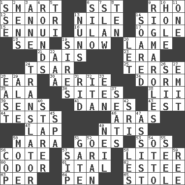 ACROSS 1. Don Adams' spy role 6. Fast jet (abbr.) 9. 17th letter of the Greek alphabet 12. Sir (Sp.) 13. "Death on the ____" 14. The Jewish people; Israel 15. World-weariness 16. Uhlan (variant) 17. Stare 18. Elected rep. 19. Frozen precipitation 20. Unable to walk 21. Raised platform 23. Period 24. Russian ruler of old 25. Laconic 28. Hearing organ 30. Nest on high 34. Dormintory (informal) 35. Wing 36. Locates 38. Cards in a Roman deck? 39. Elected reps. 41. Natives or inhabitants of Denmark 43. Eastern Standard Time (abbr.) 44. Trials 46. Caspian sea tributary 48. Infant locale 49. Nuclear Threat Initiatives 50. Hindu Mythology: god of death 51. Moves 53. Distress signal 56. ____ d'Azur (French Riviera) 57. Indian skirt 58. 61 cubic inches 60. Aroma 61. Slanted text style (abbr.) 62. First name in cosmetics 63. For each 64. Fenced enclosure 65. Fur scarf DOWN 1. Compass dir. 2. Not women's 3. Singer Murray 4. Periods in a boxing match 5. Three (prefix) 6. Grain storage tower 7. Cole _ (cabbage dish) 8. Nine, plus one 9. Complicated, petty procedures 10. Opening into or through something 11. Single 13. Religious women 14. Flew 19. Founders of families 20. Allow 22. American Automobile Association (abbr.) 24. Interpreter 26. Indian titles of respect 27. Send forth 28. Compass direction 29. Toward shelter 31. To free from 32. Call ___ day 33. Car or cant ending 37. Theater features 40. A viewer who gazes fixedly 42. Indian title of respect (Mr.) 45. Health resort 47. Aid 49. Famous astronaut Armstrong 50. Method 51. Yard entry 52. NW Algerian seaport 54. Von Bismarck 55. Stitch closed the eyes of (a falcon) 56. Police officer (slang) 57. Small drink 58. French article 59. To sift