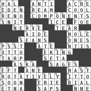ACROSS 1. Actor Linden 4. Against 8. 1/640 square mile 12. Locale of original sin 14. 480, 500 or 516 sheets of paper 15. Calm and collected 16. Former U.S. Attorney General Janet 17. Pieces 20. In a ____ (agitated or irritated) 21. Frozen water 22. Enemy 23. Impudent aggressiveness 27. Pull apart 29. Assistant 31. Undercover agent 34. Actors Connery and Penn 35. Washington bills 36. Inconspicuous attention getter 39. Had dinner 41. Nuclear Threat Initiatives 42. "Beetle Bailey" pooch 43. Supplementing with great effort 46. Canvas cover 47. Stalk of a moss capsule 48. "____ silly question..." 51. Gurus 54. Newt 56. One (Scot) 58. Vertical spar for supporting sails 61. Producing rotation 66. "Tell ____ the Marines!" 67. Within a short period 68. 4th largest of the Great Lakes 69. Monetary unit of Yemen 70. Inactive volcano in Sicily 71. Plant excrements 72. Compass dir. DOWN 1. Possessive pronoun 2. Arabian gulf 3. Soviet premier 1918-24 4. Curve 5. Modern: prefix 6. Scottish cap 7. Body of Kaffir warriors 8. Adept person 9. Meet 10. Printing process, for short 11. Otherwise 13. Short letter 18. Sep. follower 19. Born 24. Actress Charlotte 25. By way of 26. Pulitzer Prize-winning author Ferber 28. Amid 30. _____ Park, CO 32. Luau accessory 33. Double-curved letter 34. Ceases 36. Cooking vessel 37. R.R. building 38. Ski resort town in Vermont 40. Supplements with great effort 44. Call ___ day 45. Tired old horse 49. Krazy ___ of comics 50. Cuckoo 52. Independent ruler or chieftain 53. Smooth fabric 54. Celtic language 55. One third of a yard 57. Nights before holidays 59. Comedian Laurel of Laurel & Hardy 60. Lacquered or enameled metalware 62. Santa ___, CA 63. Epoch 64. Mouth edge 65. Consenting reply