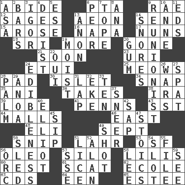 ACROSS 1. Remain 6. Parent Teacher Association (abbr.) 9. Actress Charlotte 12. Gurus 13. Period of immesurable duration 14. Post 15. Came up 16. California wine valley 17. Religious women 18. Indian title of respect (Mr.) 19. Greater amount 20. Went 21. Within a short period 23. RI univ. 24. Needle case 25. Catcalls? 28. Writing tablet 30. Small island 34. Fastener 35. Black tropical American cuckoo 36. Proceeds 38. Retirement account (abbr.) 39. Ear part 41. Actor Sean's family 43. Fast jet (abbr.) 44. Shopping centers 46. 90 degrees 48. Connecticut Ivy Leaguer 49. Back-to-school mo. 50. Sever or remove by pinching or nipping 51. Cowardly lion portrayer 53. Order of Saint Francis (abbr.) 56. Margarine 57. Grain storage tower 58. Ms. Damita and namesakes 60. Repose 61. Scram! 62. Learning spot: Fr. 63. Music discs 64. Car or cant ending 65. First name in cosmetics DOWN 1. White ___ sheet 2. Oblong pieces of solid material 3. Composer Stravinsky 4. Cease 5. Compass dir. 6. Lightbulb-shaped fruit 7. Drink excessively 8. Santa ___, CA 9. One who advocates reunion 10. Singer Murray 11. Begley and Asner 13. At once, immediately (arch.) 14. Sounds asleep 19. Wet 20. Chewing product 22. Fr. "Yes" 24. The property of being fit to eat 26. Armed conflicts 27. Petty quarrel 28. Inside of hand 29. Small Philippine buffalo 31. Infant locale 32. Make supply last 33. Nine, plus one 37. Contemptuous expression 40. American author Paul (1891-1958) 42. Plant excrement 45. Small drink 47. Unemotional ones 49. Attempt 50. Downhill vehicle 51. Louse (plural) 52. Actor Alda or Thicke 54. Groove 55. Do some clerical work 56. The grampus (Milton) 57. Compass dir. 58. Area sheltered from the wind 59. Observe