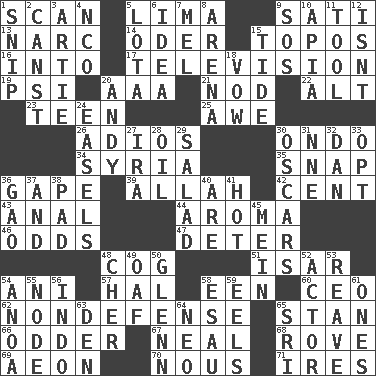 ACROSS 1. Examine minutely or intensely 5. Pale green bean 9. Suttee (variant) 13. Drug cop 14. River in Europe 15. Traditional theme or motif 16. To the inside or interior of 17. Household entertainment appliance 19. 23rd letter of the Greek alphabet 20. American Automobile Association (abbr.) 21. Allow head to fall sleepily 22. The first octave above the treble staff 23. Adolescent 25. Deep reverence 26. Goodbye (Sp.) 30. Southwest Nigerian state 34. Damascus' land 35. Fastener 36. Open wide 39. Assad's deity 42. Penny 43. Of or related to the anus 44. Scent 46. Probability 47. Prevent from occurring 48. Gear tooth 51. Austrian river, tributary to the Danube 54. Black tropical American cuckoo 57. Actor Linden 58. Car or cant ending 60. Corporate head (abbr.) 62. Unrelated to defense, as in spending 65. Comedian Laurel of Laurel & Hardy 66. More peculiar 67. Anneal 68. Be footloose 69. Age 70. Common sense 71. Angers DOWN 1. Clip 2. 2nd pers. sing. pres. of can (arch.) 3. Nick name for Arthur 4. Non-commissioned officer (abbr.) 5. Globular water bottle used in Asia 6. It may be bright or harebrained 7. Cartoonist voice _ Blanc 8. Sports stadium 9. Mayday 10. Capital of Western Samoa 11. Utensil 12. Is not 15. Event that recurs at intervals 18. Promise 20. Actor Griffith 24. Artist's stands 27. Lyricist Gershwin 28. Petroleum 29. First course 30. Motion picture awards 31. Compass dir. 32. One of the 12 tribes of Israel 33. Elect 36. E Mali city 37. Added to 38. Groovy apt. 40. "We ___ not amused" (Victoria) 41. Being at a high temperature 45. Count _ (2 wds.) 48. "Mermaids" star 49. Clumsy lout 50. American astronaut and politician John 52. Thespian 53. Rob, plunder, or pillage 54. Small Philippine buffalo 55. Connecting point 56. _ china 58. Son of Isaac 59. Snakelike fish 61. Singles 63. Lair 64. Modern: prefix 65. _ Lanka