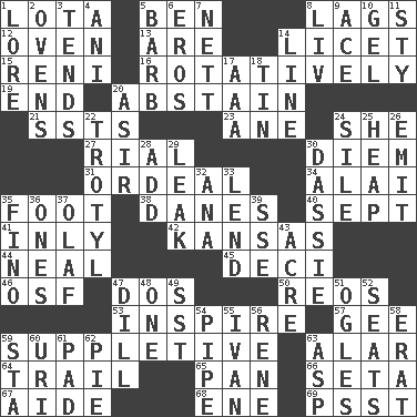 ACROSS 1. Globular water bottle used in Asia 5. Benjamin's nick name 8. Fails to keep up a pace 12. Baking chamber 13. "We ___ not amused" (Victoria) 14. It is permitted: Lat. 15. Painter Guido (1575-1642) 16. Rotating or pertaining to rotation 19. Conclude 20. Refrain by choice 21. Fast planes 23. One (Scot) 24. A female animal or person 27. Monetary unit of Yemen 30. South Vietnam president (1954) 31. Severe or trying experience 34. Jai _ 35. Lowest support of a structure 38. Natives or inhabitants of Denmark 40. Back-to-school mo. 41. Inwardly 42. Sunflower state 44. Actress Patricia 45. Tenth: prefix 46. Order of Saint Francis (abbr.) 47. Two (Sp.) 50. Vintage cars 53. Stimulate to action 57. Unit of force equal to gravity 59. Supplying deficiencies 63. Having or resembling wings 64. Hang back 65. Baking dish 66. Stalk of a moss capsule 67. Helper 68. Compass dir. 69. Inconspicuous attention getter DOWN 1. Old wives' tales, e.g. 2. Baking chambers 3. Is inclined (to) 4. Black tropical American cuckoo 5. Sharp remark 6. Greek god of love 7. Remaining after all deductions 8. 54 in ancient Rome 9. Adept person 10. Set 11. Filthy place 14. Actor's bit 17. American Automobile Association (abbr.) 18. Shallow baking pan 20. SW Saudi Arabia district 22. TNT 24. Drop; flow; fall 25. Pile 26. Send forth 28. Find the sum of 29. Path through which fluid escapes 30. Small ungulate mammals of Africa 32. Santa ___, CA 33. Grant temporary use of 35. A pale, very dry sherry 36. Singles 37. Norwegian king 39. Compass dir. 43. Measure of real estate 47. Deli pickle 48. Single 49. Fast jet (abbr.) 51. Stares at amorously 52. Theater features 54. Corncob 55. _ the terrible 56. French philosopher Descartes 58. Part of Q.E.F. 59. R.R. building 60. RI univ. 61. Groovy apt. 62. Sliced dessert 63. Viper