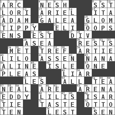 ACROSS 1. Curve 4. Soft 8. Fast jet (abbr.) 11. Australian parrot (variant) 13. Satellite of Uranus 15. Call ___ day 16. First man 17. An organ shaped like a helmet 18. Seize upon or latch onto something 19. Likely to tip or tilt 21. Connecticut Ivy Leaguer 22. I made a mistake 23. Followers of ems 24. Eastern Standard Time (abbr.) 27. HTML Container Element 29. At sea 30. Musical pauses 34. Was introduced to 36. Unclean, religiously 39. Nick name for Arthur 40. _ and Stitch 41. NE Netherlands city 43. Nanny 44. Place in a line 46. Capri or Wright 47. Single 48. Entreaties 49. One who doesn't tell the truth 51. French article 53. 100% 54. Beverage made from leaves 57. Anneal 60. "We ___ not amused" (Victoria) 63. Sports stadium 65. Whirlpool 66. Ms. Damita and namesakes 69. Austrian river, tributary to the Danube 70. Make a knot 71. Clothes sense 72. Von Bismarck 73. Nine, plus one 74. For fear that 75. Elected rep. DOWN 1. Having winglike extensions 2. "The Thinker" sculptor 3. Dice game 4. Tired old horse 5. Epoch 6. Filth; sediment 7. The bottom of a shoe or boot 8. Grain storage tower 9. Cease 10. Scottish caps 12. Naughty child 14. Put down 18. Head of state? 20. Consenting reply 25. Stalk of a moss capsule 26. Tarsus (plural) 28. Retirement account (abbr.) 29. Without tonality 31. Comedian Laurel of Laurel & Hardy 32. Prong on a fork 33. Ocean 34. Place where flour is made 35. Writer Wiesel 37. Curvy letter 38. Chap (slang) 40. Infant locale 42. Famous astronaut Armstrong 45. Compass dir. 50. Chicken ___ king 52. Table seasoning 54. Trials 55. Related on the mother's side 56. Composer Copland 57. Remaining after all deductions 58. Singer Brickell 59. An important port of Yemen 61. Monetary unit of Yemen 62. Otherwise 64. _ de Janeiro 67. ___ a Wonderful Life 68. Put into a specified state