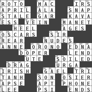 ACROSS 1. Printing process, for short 5. Apple computer (short form) 8. Big collection agency 11. Showery time 13. Chicken ___ king 14. Fastener 15. Lacking originality or spontaneity 16. Slender fish 17. Polynesian shrub of the pepper family 18. Curvy letter 19. Distinctive style or manner 21. French painter Edouard 22. Person who is morally reprehensible 24. Eras 25. Motion picture awards 27. Title for a knight 29. Tail end 30. Unadorned figures 32. Singer Murray 33. U. of Maine site 35. Pulitzer Prize-winning author Ferber 39. Drug addict 41. Grant temporary use of 42. Shoshoni 43. Dirtied 45. To draw with force 48. Capital and largest city of Mongolia 49. From or relating to Ireland 50. Highlander 52. Three (prefix) 55. Hyperbolic tangent 56. Male child 57. Flexible twig of a willow tree 59. Domed church section 60. Fitting 61. Give a jingle 62. Area sheltered from the wind 63. Air pressure measure (abbr.) 64. Conclusions DOWN 1. Raze (variant) 2. Elects 3. File 13 4. Petroleum 5. Wise men 6. Actor Alda or Thicke 7. 4-wheeled motor vehicle 8. Empty; void 9. All-night dance parties 10. Argument over a trivial matter 12. Prying instrument 14. Heroin 20. Raised railways 21. Female horse 23. Having ears or earlike features 25. Mouth or opening 26. Elected rep. 27. Player for Phoenix 28. Wedding promise 30. Not either 31. Major League Baseball Commissioner Bud 33. Choose 34. To separate or throw off 36. Accusation by an informer 37. Compass dir. 38. Say or write further 40. Ending for "Through" and "Enough" 43. Institute legal proceedings 44. Lowest deck of a ship 45. Window treatment 46. Remove soap 47. American tennis player Robert 49. Slanted text style (abbr.) 50. Republicans 51. Against 53. Tear apart 54. Angers 56. Plant excrement 58. A female animal or person