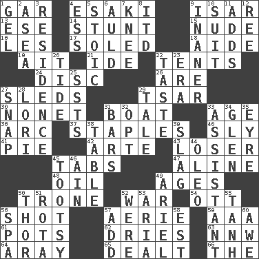 ACROSS 1. Slender fish 4. 1973 Nobel Price Winner (Physics) Leo 9. Austrian river, tributary to the Danube 13. Compass dir. 14. Check the growth or development of 15. Naked 16. French article 17. Having a sole or soles 18. Helper 19. Small island 21. Binary compound 22. Portable shelters 24. Compact _ 26. "We ___ not amused" (Victoria) 27. Bobsleighs 29. Russian ruler of old 30. Music written for nine 31. Water vessel 33. Personal question 36. Curve 37. Paper fasteners 40. Secret 41. Sliced dessert 42. Johnson of "Laugh-In" 43. Failure 45. Bar bills 47. Place in a line 48. Petroleum 49. Eras 50. Marketplace scale 52. Armed conflict 54. Baseball player Mel 56. Guess 57. Nest on high 59. Auto club (abbr.) 61. Plant holders 62. Frees from moisture 63. Compass dir. 64. Like ___ of sunshine 65. Started a card game 66. Definite Article DOWN 1. Set 2. Toward the sea 3. Home 4. Double-curved letter 5. Unemotional 6. Old (Scot.) 7. Leg joint 8. It would 9. Sillier 10. Set or collection 11. Sums up 12. To sift 20. Periodic rise and fall of the sea level 22. Clothes sense 23. Epoch 25. Fast planes 27. Fastener 28. Australian parrot (variant) 29. Falsehood 31. Long, evenly shaped pieces 32. Choose 33. Helper 34. Small, secluded valley 35. Jane of fiction 38. Eating place 39. Volcanic refuse 44. Butter sub 45. Tootsie (variant) 46. The 18th letter of the Arabic alphabet 49. Satellite of Uranus 50. Son of Odin 51. Round or rotation of duties 52. Past tense of be (plural) 53. Roberta Peters solo 55. Hyperbolic tangent 56. Health resort 57. Increase 58. Eastern Standard Time (abbr.) 60. Deep reverence
