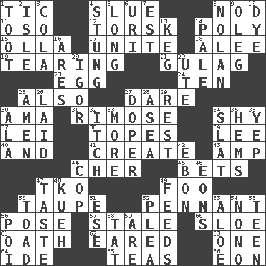 ACROSS 1. Nervous spasm 4. Change direction abruptly 8. Dreamland 11. Bear (Spanish) 12. Cod relative 14. Many (prefix) 15. Rounded earthenware pot or jar 17. Join together 18. Toward shelter 19. Lacerating 21. Russian prison camp 23. Oval reproductive body of a fowl 24. "___ Little Indians" 25. In addition 27. Have the gumption 30. Nursemaid (var.) 31. Full of chinks, cracks, or crevices 34. Like a shrinking violet 37. Luau accessory 38. Drinks excessively 39. Area sheltered from the wind 40. Also 41. Make 43. Electrical Unit 44. "Mermaids" star 45. Wagers 47. Ring climax 49. Egg _ yung 50. Grayish beige 52. Pre-World Series prize 56. Airs 57. Lacking originality or spontaneity 60. A type of plum 61. Pledge 62. Having ears or earlike features 63. Single 64. Binary compound 65. Afternoon social gatherings 66. Age DOWN 1. A blast of a horn 2. Small island 3. Root beer relative 4. Feeling sharp psychological pain 5. Having great length 6. RI univ. 7. Eastern Standard Time (abbr.) 8. Pitcher Ryan 9. Cassini of fashion 10. Color 13. Barrel 14. Diluted with white 16. Ancient Greek god of war 20. Composer Stravinsky 22. Shoshoni 25. So be it 26. Put down 27. Drug addict 28. At sea 29. Take ten 30. Wing 32. Hankering 33. Greater amount 34. Narrow board 35. Equivocates 36. Slangy assent 42. Inky black, to poets 44. Police officer (slang) 46. Immeasurably long periods of time 47. Clothes sense 48. Malaysian steamed pastry 49. Gives food to 50. Frog relative 51. Compass dir. 52. Entreaty 53. _ vera 54. Words to Nanette 55. Adolescent 56. Luau course 58. Make lace 59. "We ___ not amused" (Victoria)