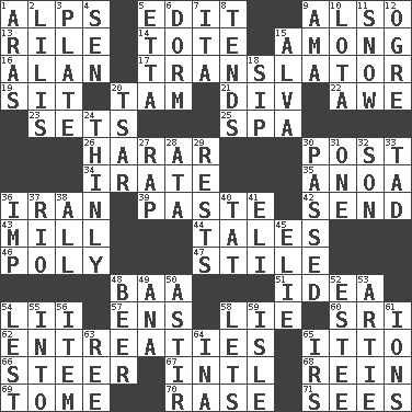 ACROSS 1. High mountains 5. Prepare for publication 9. In addition 13. Cause heat under the collar 14. Carryall 15. Amid 16. ____ Jay Lerner 17. Interpreter 19. Be seated 20. Scottish cap 21. HTML Container Element 22. Deep reverence 23. Puts into a specified state 25. Health resort 26. Ethiopian city, capital of Harari 30. Mail 34. Feeling or showing extreme anger 35. Small Philippine buffalo 36. SW Asia republic 39. Thick mixture 42. Post 43. Place where flour is made 44. Lies 46. Much (prefix) 47. Vertical member of a panel or frame 48. Sound made by sheep 51. The main thing one is thinking about 54. Cards in a Roman deck? 57. Followers of ems 58. Untruth 60. _ Lanka 62. Pleas 65. "Tell ____ the Marines!" 66. Guide 67. International (abbr.) 68. It's straight from the horse's mouth 69. Heavy book 70. To erase 71. Observes DOWN 1. Ancient river in northeast Turkey 2. Ms. Damita and namesakes 3. Food holder 4. Elected rep. 5. Singer James 6. Dormintory (informal) 7. Call ___ day 8. Watches over 9. Nanny (var.) 10. Globular water bottle used in Asia 11. Frozen precipitation 12. Legendary monster 15. Inventor's middle name 18. Small drink 20. Russian ruler of old 24. Without thickness 27. Reproach for some lapse or misdeed 28. "One Day ___ Time" 29. Musical pauses 30. Went by 31. Single 32. Male offspring 33. Bit 36. Mischievous child 37. River (Sp.) 38. 100% 40. Make lace 41. Biblical high priest 45. Writer Wiesel 48. Fermented drink made from hops 49. Santa ___, CA 50. Having gotten out of bed 52. First name in cosmetics 53. Nick name for Arthur 54. For fear that 55. To the inside or interior of 56. A distinct part 58. Allows 59. Capri or Wright 61. Charged particles 63. Portuguese money of account (variant) 64. _ tizzy (2 wds.) 65. Big collection agency