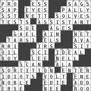 ACROSS 1. Adept person 4. Curvy letter 7. Sinks 11. Plant excrement 12. Snake ____ (dice throw) 13. Chummy 14. Fast jet (abbr.) 15. Remaining after all deductions 16. Finds the solution 17. Trials 19. Helper 21. Institute legal proceedings 23. Eons 24. Highlander 25. The 18th letter of the Arabic alphabet 26. Fish or hair follower 29. Tarsus (plural) 30. Raised railways 31. Actress Gardner 32. Medical imaging device (abbr.) 33. Big collection agency 34. Be seated 35. Lubricate 36. _-fi 37. Standard of perfection 40. Male child 41. Area sheltered from the wind 42. 1994 drama film starring Jodie Foster 43. Skim 45. Insect wing 46. Casting lots 51. Keyboard key 55. Foolish or stupid persons 56. Electrical Unit 58. Compass dir. 59. Having high moral qualities 60. Singer Brickell 61. Find the sum of 62. Celtic language 63. Born 64. Friend of Pooh DOWN 1. Inconspicuous attention getter 2. Raze (variant) 3. Chooses 4. Sight organ 5. Stalk of a moss capsule 6. Fast planes 7. Table seasonings 8. Inventor's middle name 9. Small, secluded valley 10. System (abbr.) 12. Follows as a consequence or result 13. Airs 16. Attaches a signature 18. Russian ruler of old 20. Moves on water 22. Connecticut Ivy Leaguer 24. Lightheartedly 25. Nest on high 26. Rhinal 27. Morally bad or wrong 28. Make lace 29. Musical group of three 32. Crowd into 33. Ancient Celtic tribe of eastern Britain 36. Narrow boards 37. _ tizzy (2 wds.) 38. Keyboard key 39. Liveliness 43. Took without asking 44. Quote 46. Trig term 47. Aroma 48. Chest bones 49. Baking chamber 50. Thickened enlargement 52. Rend 53. Inside; within (prefix) 54. Do over again 57. Whopper