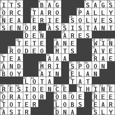 ACROSS 1. ___ a Wonderful Life 4. Container for groceries 7. Settles 11. The grampus (Milton) 12. Pacific island yam 13. Friendly 14. Teachers' org. 15. One of the Great Lakes 16. Finds the solution 17. Sir (Sp.) 19. Helper 21. Lair 23. Ancient Greek god of war 24. Wig 25. One (Scot) 26. Acquire through effort 29. Cowboy competition 30. Mountains (abbr.) 31. "___ Maria" 32. Afternoon social gathering 33. Auto club (abbr.) 34. Actress Charlotte 35. Also 36. Medical imaging device (abbr.) 37. Soup utensil 40. Male child 41. The 18th letter of the Arabic alphabet 42. Liveliness 43. Globular water bottle used in Asia 45. Make lace 46. Dwelling 51. One or ones belonging to thee 55. Speaker 56. Mitch Miller's instrument 58. Portuguese money of account (variant) 59. Carrier 60. Tennis shots 61. Hearing organ 62. SW Saudi Arabia district 63. Heredity factor (abbr.) 64. Playfully artful DOWN 1. Charged atoms 2. Family _ (genealogy) 3. Examine hastily 4. Drinking establishment 5. Roberta Peters solo 6. Leaves 7. Table seasonings 8. Inventor's middle name 9. Small, secluded valley 10. System (abbr.) 12. Cigar-shaped 13. Introduce or present, as a question 16. Begets 18. Wrote a lyric poem 20. Before Barbara or Clara 22. Modern: prefix 24. Sycophant 25. At full speed 26. Make _____ (do battle with) 27. "Terrible" tsar 28. Born 29. Former U.S. Attorney General Janet 32. Keyboard key 33. Believer in; advocate of (suffix) 36. Mother 37. Arrange properly for use 38. Food holders 39. Pledge 43. 61 cubic inches 44. Scent 46. Round or rotation of duties 47. Greek god of love 48. Suttee (variant) 49. Chilled 50. Inky black, to poets 52. Angers 53. Be tempered by heat 54. Suggestive of the supernatural 57. Chief or king in Benin or Nigeria