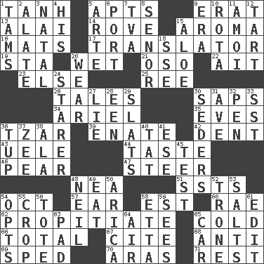 ACROSS 1. Hyperbolic tangent 5. Flats, for short 9. Part of Q.E.F. 13. Mountain range southwest of Kyrgyzstan 14. Be footloose 15. Scent 16. Floor protectors 17. Interpreter 19. R.R. building 20. Dripping 21. Bear (Spanish) 22. Small island 23. Otherwise 25. To separate or throw off 26. Lies 30. Plant excrements 34. Satellite of Uranus 35. Nights before holidays 36. Russian ruler 39. Related on the mother's side 42. Gouge 43. Ubangi River tributary 44. Clothes sense 46. Lightbulb-shaped fruit 47. Navigate 48. Teachers' org. 51. Fast planes 54. Sep. follower 57. Hearing organ 58. Eastern Standard Time (abbr.) 60. Actress Charlotte 62. Conciliate 65. Lacking warmth 66. Add up to 67. Quote 68. Against 69. Drove too fast 70. Ancient river in northeast Turkey 71. Repose DOWN 1. Scottish caps 2. Having winglike extensions 3. Relating to or accompanying birth 4. Part of HMS, perhaps 5. Johnson of "Laugh-In" 6. Sweet dark-red dessert wine 7. Federal power corp. 8. Sir (Sp.) 9. Epoch 10. Round or rotation of duties 11. Mine, in Marseilles 12. Small pie 15. Medicinal plant 18. Compass dir. 20. Erode 24. A viewer who gazes fixedly 27. Falsehood 28. Car or cant ending 29. Narrow boards 30. Spring feasts 31. "___ Maria" 32. Fenced enclosure 33. Fast jet (abbr.) 36. Uncastrated adult male sheep 37. Last letter of the English alphabet 38. In the manner of 40. Make lace 41. Compass dir. 45. Trial 48. Famous astronaut Armstrong 49. Consume 50. N. Chile seaport 52. Heavy duty weighing machine 53. Table seasonings 54. Chooses 55. Riding implement 56. Carryall 58. Singer James 59. Observes 61. Prepare for publication 63. Groovy apt. 64. Atmosphere 65. Auto