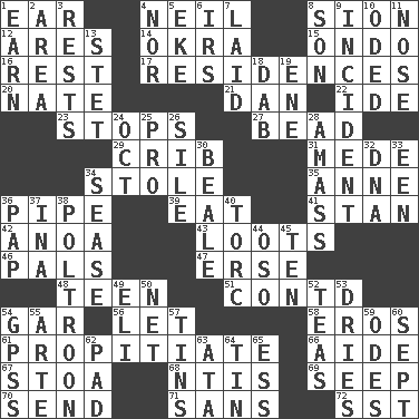 ACROSS 1. Hearing organ 4. Famous astronaut Armstrong 8. The Jewish people; Israel 12. Ancient Greek god of war 14. Gumbo ingredient 15. Southwest Nigerian state 16. Take ten 17. Homes 20. Nathan's nickname 21. Daniel's nick name 22. Binary compound 23. Discontinues 27. Necklace unit 29. Baby bed with high sides 31. Ancient Persian 34. Took without asking 35. Singer Murray 36. Corncob 39. Ingest 41. Comedian Laurel of Laurel & Hardy 42. Small Philippine buffalo 43. Plunders 46. Friends 47. Celtic language 48. Adolescent 51. Continued (abbr.) 54. Slender fish 56. Allow 58. Greek god of love 61. Conciliate 66. Assistant 67. Portico 68. Nuclear Threat Initiatives 69. Ooze 70. Transmit 71. Without 72. Fast jet (abbr.) DOWN 1. Merit 2. Type of rug 3. Musical pauses 4. And not 5. Supplement with great effort 6. Big collection agency 7. Put down 8. Boy, to dad 9. Event 10. Wrote a lyric poem 11. Sense of smell 13. Proofreading order 18. Pat or tap gently 19. Compass dir. 24. Sep. follower 25. Adept person 26. Drop; flow; fall 28. Collect or gather 30. Calif. Air Force Base 32. Heredity factor (abbr.) 33. Car or cant ending 34. Gospel singer Marvin 36. Infant food 37. _ tizzy (2 wds.) 38. Characterized by complete cowardliness 40. Torque (variant) 44. Bear (Spanish) 45. Nine, plus one 49. Biblical high priest 50. Fish or hair follower 52. Beverages made from leaves 53. Frees from moisture 54. Global Positioning Systems (abbr.) 55. Johnson of "Laugh-In" 57. Metal containers 59. Lyric poems 60. Back-to-school mo. 62. Writing tablet 63. _ moment's notice (2 wds.) 64. Shallow baking pan 65. Double-curved letter