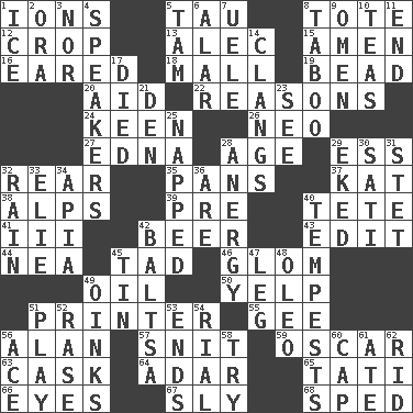 ACROSS 1. Charged atoms 5. The 19th letter of the Greek alphabet 8. Haul 12. Riding implement 13. Actor Baldwin 15. So be it 16. Having ears or earlike features 18. Promenade 19. Necklace unit 20. Help 22. Thinks logically 24. Peachy ____! 26. Modern: prefix 27. Pulitzer Prize-winning author Ferber 28. Personal question 29. Curvy letter 32. Stern 35. Zero-star reviews 37. Krazy ___ of comics 38. High mountains 39. Before (prefix) 40. Wig 41. One more than two 42. Fermented drink made from hops 43. Prepare for publication 44. Teachers' org. 45. Small boy 46. Seize upon or latch onto something 49. Lubricate 50. Sharp bark 51. Hard copy producer 55. Turn to the right 56. ____ Jay Lerner 57. In a ____ (agitated or irritated) 59. Witty Wilde 63. Keg 64. The sixth month of the Jewish calendar 65. Jacques of French films 66. Snake ____ (dice throw) 67. Cunning 68. Broke a traffic law DOWN 1. Frozen water 2. Mouth or opening 3. And not 4. Orators 5. Scottish cap 6. Having or resembling wings 7. Ubangi River tributary 8. Off limits 9. Sign of things to come 10. Beverages made from leaves 11. Conclusion 14. Gives out a loud, resonant sound 17. Passed on 21. Lair 23. Observe 25. Slept 28. Disorder of the immune system 29. Supplemented with great effort 30. Suttee (variant) 31. Proofreading order 32. Water falling in drops from the sky 33. Writer Wiesel 34. Capital of Western Samoa 36. "We ___ not amused" (Victoria) 40. Storms 42. Greek mezzo-soprano Agnes 45. Metal container 47. Part of a journey 48. Margarine 49. Pig sounds 51. Romp 52. Raze (variant) 53. Conclusions 54. Monetary unit of Yemen 56. Adept person 58. Attempt to accomplish something 60. Head covering 61. Had dinner 62. To free from