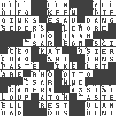 ACROSS 1. Waist strap 5. Shade tree 8. Everything 11. Margarine 12. Peachy ____! 14. Pass on 15. Pig sounds 17. He sold his birthright 18. Mild oath, euphamism for damn 19. Spring feasts 21. Poe poem 23. Wedding promise 25. "Terrible" tsar 26. Russian ruler of old 27. Period of immesurable duration 28. _-fi 31. Corporate head (abbr.) 33. Krazy ___ of comics 35. Flexible twig of a willow tree 37. US Secretary of Labor Elaine L. _ 38. _ Lanka 40. Lodging establishments 41. Thick mixture 43. D.D.E's nickname 45. Allow 46. "We ___ not amused" (Victoria) 47. 17th letter of the Greek alphabet 50. "Beetle Bailey" pooch 52. Austrian river, tributary to the Danube 53. Compass dir. 54. Device for capturing images 56. Help 61. Central Nebraska county 62. Tiny particle 65. Clothes sense 66. Pipe bend 67. Respite 68. Uhlan (variant) 69. June honoree 70. Two (Sp.) 71. Scratch DOWN 1. Expressions of contempt or scorn 2. Writer Wiesel 3. Grant temporary use of 4. Casino tip 5. Make supply last 6. French article 7. Ear of corn 8. The sixth month of the Jewish calendar 9. Actor's bit 10. Part of a journey 13. New (sp.) 16. Indian titles of respect 18. Spanish title 20. Neighbor of Neb. 22. Billionth: prefix 24. Mouths or openings 26. A blast of a horn 28. Trig term 29. Penny 30. Big collection agency 31. Burn to charcoal 32. Relaxation 34. Three (prefix) 36. Grain storage tower 37. Numbers guy (abbr.) 39. Picture 42. Celtic language 44. Inactive volcano in Sicily 48. Ethiopian city, capital of Harari 49. Spoke pompously 51. Trial 52. Naughty child 54. Root beer relative 55. Old (Scot.) 57. Saudi Arabian king (1953-1964) 58. Capri or Wright 59. Comedian Laurel of Laurel & Hardy 60. Portable shelter 61. Directed 63. Bear (Spanish) 64. Mountains (abbr.)