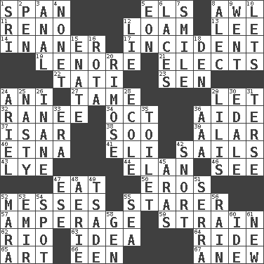 ACROSS 1. Connect, as a bridge 5. Raised railways 8. Leather borer 11. Western Nevada city 12. Rich soil 13. Area sheltered from the wind 14. More lacking in sense or substance 17. Happening 19. Poe poem 21. Opts 22. Jacques of French films 23. Elected rep. 24. Black tropical American cuckoo 27. Not wild 29. Allow 32. Indian princess (variant) 34. Sep. follower 36. Assistant 37. Austrian river, tributary to the Danube 38. "Barney Miller" actor Jack 39. Having or resembling wings 40. Inactive volcano in Sicily 41. Connecticut Ivy Leaguer 42. Moves on water 43. Potassium hydroxide 44. Flair 46. Observe 47. Consume 50. Greek god of love 52. Makes clutter 55. A viewer who gazes fixedly 57. Electrical Measurement 59. Put through a sieve 62. River (Sp.) 63. It may be bright or harebrained 64. Travel on an animal 65. Nonscientific branch of learning 66. Car or cant ending 67. Afresh DOWN 1. _ Lanka 2. Animal enclosure 3. Of or related to the anus 4. Music written for nine 5. Age 6. Shoestrings 7. Grin 8. Actor Baldwin 9. Left 10. Allows 12. Whopper 15. Maternal 16. Round or rotation of duties 18. Lair 20. Full of chinks, cracks, or crevices 24. Satellite of Uranus 25. Difficult 26. Empty; void 28. Learning spot: Fr. 29. Ms. Damita and namesakes 30. Peak District village in England 31. Laconic 33. Epoch 35. Bathroom 36. Auto club (abbr.) 42. Derisive sound 45. Ancient river in northeast Turkey 47. Compass dir. 48. Nest on high 49. Sadhe (variant) 51. Father Junipero _ 52. Hindu Mythology: god of death 53. Independent ruler or chieftain 54. Blemish 55. Ocean 56. Precipitation 58. Commissioned military rank (abbr.) 60. Binary compound 61. ___ Haven, CT