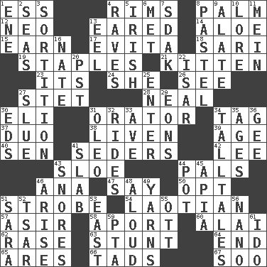 ACROSS 1. Double-curved letter 4. Basketball hoops 8. Inside of hand 12. Modern: prefix 13. Having ears or earlike features 14. Medicinal plant 15. Merit 17. Webber/Rice musical 18. Indian skirt 19. Paper fasteners 21. Baby cat 23. It is 24. A female animal or person 26. Perceive with the eye 27. Proofreading order 28. Actress Patricia 30. Connecticut Ivy Leaguer 31. Speaker 34. Label 37. Superhero pair 38. Make or become more lively 39. Ripen 40. Elected rep. 41. Spring feasts 42. Area sheltered from the wind 43. _ gin 44. Friends 46. Santa ___, CA 47. Declare 50. Elect 51. Disco prop 54. Of or relating to Laos or its people 57. SW Saudi Arabia district 58. To the left, to Queeg 60. Jai _ 62. Raze (variant) 63. Check the growth or development of 64. Conclusion 65. Ancient Greek god of war 66. Small boys 67. "Barney Miller" actor Jack DOWN 1. Compass dir. 2. Oceans 3. Determination 4. All-night dance parties 5. From or relating to Ireland 6. Was introduced to 7. Neighbor of Neb. 8. Soft color 9. Having winglike extensions 10. Old wives' tales, e.g. 11. Count _ (2 wds.) 13. Snakelike fish 16. Nathan's nickname 20. Pacific Standard Time (abbr.) 22. Austrian river, tributary to the Danube 25. Keyboard key 27. Change direction abruptly 29. Immeasurably long periods of time 30. Begley and Asner 31. Margarine 32. Amusement-park features 33. "___ Maria" 34. Baron Munchausen's specialties 35. Matures 36. Turn to the right 41. Thick slice 43. Sounds asleep 44. Cooking vessel 45. Capital of Western Samoa 46. Ascend 48. Verbally 49. Tall tales 51. "Two Mules for Sister ____" 52. Russian ruler of old 53. Compass direction 55. Baseball player Mel 56. Billionth: prefix 59. Parent Teacher Assoc. 61. Wedding promise