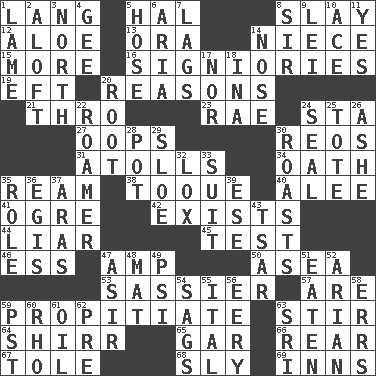 ACROSS 1. Austrian-born American filmmaker Fritz 5. Actor Linden 8. Kill 12. Medicinal plant 13. Mouth or opening 14. Sibling's daughter 15. Greater amount 16. Seigniories (variant) 19. Newt 20. Thinks logically 21. Through, poetically 23. Actress Charlotte 24. R.R. building 27. I made a mistake 30. Vintage cars 31. Ringlike coral islands and reefs 34. Pledge 35. 480, 500 or 516 sheets of paper 38. Woman's close-fitting hat 40. Toward shelter 41. Legendary monster 42. Is 44. One who doesn't tell the truth 45. Trial 46. Double-curved letter 47. Electrical Unit 50. Toward the sea 53. More impudent 57. "We ___ not amused" (Victoria) 59. Conciliate 63. Tumult 64. Bake eggs in their shells 65. Slender fish 66. Rump 67. Lacquered or enameled metalware 68. Mischievous 69. Lodging establishments DOWN 1. Unable to walk 2. At or to great height 3. Compass direction 4. Turn to the right 5. Flexible conduit 6. Roberta Peters solo 7. Fails to keep up a pace 8. Title for a knight 9. Flowery wreath 10. Adept person 11. It is so 14. Olfactory organ 17. And not 18. _ tizzy (2 wds.) 20. Carrot, for example 22. Wanderer 24. Lick closed 25. Carry 26. American tennis player Robert 28. Plant holder 29. A type of plum 30. Ridicules or criticizes harshly 32. Brine-cured salmon 33. Set of matching outer garments 35. Hero or heavy, e.g. 36. Armor plate that protects the chest 37. Ancient river in northeast Turkey 39. Compass dir. 43. Russian ruler of old 47. SW Saudi Arabia district 48. Floor protector 49. 23rd letter of the Greek alphabet 51. Consumed 52. Believer in; advocate of (suffix) 54. Settles 55. Slanted text style (abbr.) 56. Suggestive of the supernatural 58. Blunders 59. Pacific Standard Time (abbr.) 60. 17th letter of the Greek alphabet 61. Petroleum 62. Before (prefix) 63. _ Lanka