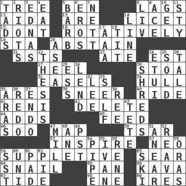 ACROSS 1. Relationship diagram 5. Benjamin's nick name 8. Fails to keep up a pace 12. Opera by Verdi 13. "We ___ not amused" (Victoria) 14. It is permitted: Lat. 15. Do not 16. Producing rotation 19. R.R. building 20. Choose not to consume 21. Fast planes 23. Had dinner 24. Eastern Standard Time (abbr.) 27. Person who is morally reprehensible 30. Portico 31. Artist's stands 34. Frame or body of a ship 35. Ancient Greek god of war 38. Scornful expression 40. Travel on or in a vehicle 41. Painter Guido (1575-1642) 42. Keyboard key 44. Does sums 45. Nourish 46. "Barney Miller" actor Jack 47. Atlas unit 50. Russian ruler of old 53. Stimulate to action 57. Modern: prefix 59. Supplying deficiencies 63. Wither 64. Slow-paced one 65. Baking dish 66. Polynesian shrub of the pepper family 67. Periodic rise and fall of the sea level 68. Compass dir. 69. Angers DOWN 1. Small amounts or degrees 2. Debaucheries 3. Ferber et al. 4. Erode 5. Sharp remark 6. Greek god of love 7. Remaining after all deductions 8. 54 in ancient Rome 9. Adept person 10. Set 11. Filthy place 14. Actor's bit 17. Auto club (abbr.) 18. Teat (slang) 20. Toward the sea 22. College paper 24. Needle holder 25. Disposed of to a purchaser 26. Lie 28. Curvy letter 29. Grant temporary use of 30. Tears up 32. Area sheltered from the wind 33. Itself 35. Ancient river in northeast Turkey 36. Do over again 37. Inside; within (prefix) 39. To riddle 43. False hair 47. Place where flour is made 48. A saturated hydrocarbon 49. Pacific Standard Time (abbr.) 51. Approach 52. Break or tear apart 54. Corncob 55. "Terrible" tsar 56. French philosopher Descartes 58. Mouths or openings 59. Fast jet (abbr.) 60. University (slang) 61. Writing tablet 62. Sliced dessert 63. What Jean-Claude Killy likes to do