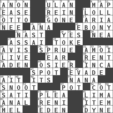 ACROSS 1. Soon (poet.) 5. Uhlan (variant) 9. Atlas unit 12. Relaxation 13. It's straight from the horse's mouth 14. Hang loosely or laxly 15. Von Bismarck 16. Went 17. Operatic vocal solo 18. Born 19. Santa ___, CA 21. Black 22. Political cartoonist Thomas 24. Affirmative reply 26. Teachers' org. 27. Slender Brazilian palm 28. Casino tip 29. Deliberation 30. Upset 32. Mine, in Marseilles 36. Not recorded 37. Ewer handle 38. Monthly bill 39. Arabian gulf 40. Flexible twig of a willow tree 42. South American Indian 43. Blemish 44. Dodge 46. Small island 49. ___ a Wonderful Life 50. Grandmother 51. Snout, nose 53. Cooking vessel 54. Small bed 57. Suttee (variant) 58. Entreaty 61. Pale green bean 62. Of or related to the anus 63. Painter Guido (1575-1642) 64. Detail 65. Cartoonist voice _ Blanc 66. Genesis locale 67. Unit of force DOWN 1. Age 2. Nathan's nickname 3. Clearly or manifestly demonstrative 4. Modern: prefix 5. Capital and largest city of Mongolia 6. Lion 7. The 18th letter of the Arabic alphabet 8. Compass dir. 9. Person of subnormal intelligence 10. Place in a line 11. Beach, in Buenos Aires 14. Experiment locale 19. White ___ sheet 20. Nuclear Threat Initiatives 21. Compass dir. 23. NE Netherlands city 24. You are 25. Supplement with great effort 27. Enthusiastic 28. Distinguishing feature 29. Insect wing 31. Mexican monetary units 32. Believer in; advocate of (suffix) 33. Ananias' fault 34. Single time 35. Call ___ day 40. Elect 41. Former U.S. Attorney General Janet 43. Be seated 45. Large container 46. Indian state 47. Empty; void 48. "_____ Recall" 52. Petroleum 53. Ache 55. Sign of something about to happen 56. Docile 58. Before (prefix) 59. Directed 60. Compass dir. 61. Flaplike covering