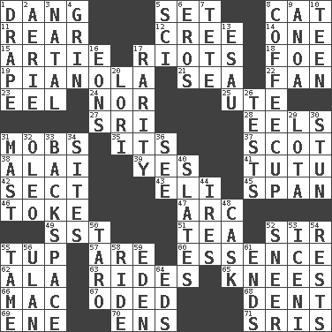 ACROSS 1. Mild oath, euphamism for damn 5. Arrange properly for use 8. Domesticated feline 11. Located in or toward the back 12. Algonquian 14. Single 15. Nick name for Arthur 17. Debaucheries 18. Enemy 19. Player piano 21. Ocean 22. Avid follower 23. Snakelike fish 24. And not 25. Shoshoni 27. Indian title of respect (Mr.) 28. Snakelike fish 31. Disorderly crowds 35. ___ a Wonderful Life 37. Highlander 38. Jai ____ 39. Consenting reply 41. Ballerina skirt 42. Religious group 43. Connecticut Ivy Leaguer 45. Connect, as a bridge 46. Casino tip 47. Curve 49. Fast jet (abbr.) 51. Beverage made from leaves 52. Title for a knight 55. Uncastrated adult male sheep 57. "We ___ not amused" (Victoria) 60. Center 62. Insect wing 63. Amusement-park features 65. Leg joints 66. Big _ 67. Wrote a lyric poem 68. Gouge 69. Compass dir. 70. Followers of ems 71. Indian titles of respect DOWN 1. Window treatment 2. Nest on high 3. Brizilian seaport 4. Broad smile 5. _-fi 6. Greek god of love 7. Wig 8. Java holder (2 wds.) 9. Small Philippine buffalo 10. Adolescent 13. Son of Isaac 16. Immeasurably long periods of time 17. Noteworthy scarcity 20. Australian parrot (variant) 26. Trials 29. Globular water bottle used in Asia 30. Astound 31. Vertical spar for supporting sails 32. Margarine 33. Keyboard key 34. Locates 36. Observe 40. Chalkboards 44. Angers 48. Keg 50. Edible starchy tuberous root 52. Contemptuous expression 53. Ancient Celtic tribe of eastern Britain 54. Musical pauses 55. Not wild 56. ____ Bator 58. Travel on an animal 59. Genesis locale 61. Conclusions 64. Begley and Asner