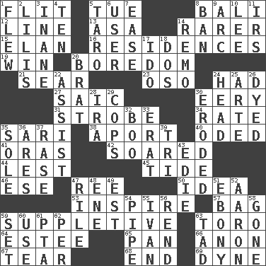 ACROSS 1. Secret move to avoid paying debts 5. Third day of the wk. 8. Indonesian resort city 12. Actor's bit 13. White ___ sheet 14. Less widely known 15. Style 16. Dwellings 19. Victory 20. Mood resulting from idleness 21. Singe 23. Bear (Spanish) 24. Possessed 27. Ketch in the Levant 30. Suggestive of the supernatural 31. Disco prop 34. Pace 35. Indian skirt 38. To the left, to Queeg 40. Wrote a lyric poem 41. Mouths or openings 42. Flew 44. For fear that 45. Event that recurs at intervals 46. Compass dir. 47. To separate or throw off 50. The main thing one is thinking about 53. Motivate 57. Container for groceries 59. Supplementary 63. "Corrida" creature 64. First name in cosmetics 65. Baking dish 66. Soon (poet.) 67. Pull apart 68. Conclusion 69. Centimeter-gram-second unit of force DOWN 1. Soared 2. Ms. Damita and namesakes 3. Silly 4. Nine, plus one 5. Edible starchy tuberous root 6. One who uses or employs something 7. Relaxation 8. Prohibit 9. Curve 10. Area sheltered from the wind 11. Big collection agency 14. San ____ (Riviera town) 17. Wedding promise 18. Two (Sp.) 20. Naughty child 22. Help 24. Froth on beer 25. Johnson of "Laugh-In" 26. Colored 28. Retirement account (abbr.) 29. 911 reaches them 30. Worn away 32. Sometimes accompanies a hiss 33. Part of Q.E.F. 35. Flatfish 36. Ancient Greek god of war 37. To erase 39. Three (prefix) 43. Singer Brickell 47. Cause heat under the collar 48. Compass dir. 49. Eastern Standard Time (abbr.) 51. Black 52. Composer Copland 54. Corncob 55. _ the terrible 56. Tear apart 58. Went 59. Arrange properly for use 60. Purpose 61. Parent Teacher Association (abbr.) 62. For each 63. Small boy