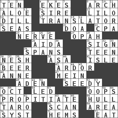 ACROSS 1. Nine, plus one 4. Makes supply last 8. Bowlike part 12. Medicinal plant 14. Male parent of an animal 15. _ and Stitch 16. Deli pickle 17. Interpreter 20. Oceans 21. ___ good deed 22. Numbers guy (abbr.) 23. Boldness 27. Brightly colored fish 29. Opera by Verdi 31. Public display of a written message 34. Connects, as a bridge 35. Adolescent 36. Tender 39. White ___ sheet 41. Capri or Wright 42. Fermented drink made from hops 43. Zeal 46. Queen of England 1702-14 47. Chow _ 48. Arabian gulf 51. Full of seeds 54. Sep. follower 56. Directed 58. I made a mistake 61. Appease 66. Frame or body of a ship 67. Edible starchy tuberous root 68. Glance over 69. Length times width 70. System (abbr.) 71. Equivocates 72. Consume DOWN 1. Small boys 2. Writer Wiesel 3. Pitcher Ryan 4. Eastern Standard Time (abbr.) 5. Apertif with cassis 6. Period 7. Post 8. According to 9. Actors Guy, Robert Welles, and Clint 10. Hoof sound 11. Israeli folk dance 13. Otherwise 18. "Barney Miller" actor Jack 19. Infant locale 24. Hit sharply and swiftly 25. By way of 26. Pulitzer Prize-winning author Ferber 28. Moving about 30. Indian state 32. Set 33. Compass dir. 34. Tear up 36. Basketball assoc. 37. Car or cant ending 38. Legislators 40. Ancient Greek god of war 44. Pass on 45. Single 49. Connecticut Ivy Leaguer 50. Fish or hair follower 52. Capital of the state of Qatar 53. You are 54. Elects 55. Supercomputer manufacturer 57. Food container 59. Entreaty 60. Narrow board 62. Plant holder 63. Adept person 64. Scottish cap 65. Followers of ems