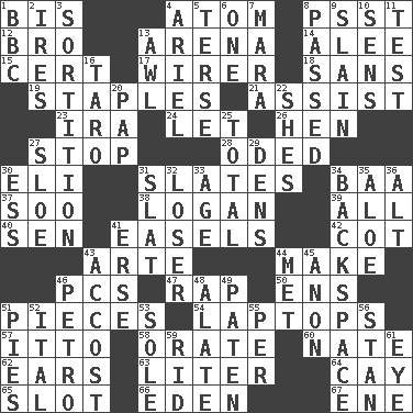 ACROSS 1. Again 4. Smallest unit of an element 8. Inconspicuous attention getter 12. Sis' sibling 13. Sports stadium 14. Toward shelter 15. Foregone conclusion 17. One who wires 18. Without 19. Paper fasteners 21. Aid 23. Retirement account (abbr.) 24. Allow 26. Layer 27. Discontinue 28. Wrote a lyric poem 30. Biblical high priest 31. Chalkboards 34. Sound made by sheep 37. "Barney Miller" actor Jack 38. Utah city north of Ogden 39. Everything 40. Elected rep. 41. Artist's stands 42. Small bed 43. Johnson of "Laugh-In" 44. Create 46. Personal Computers (abbr.) 47. Strike 50. Followers of ems 51. Parts 54. Portable computers 57. "Tell ____ the Marines!" 58. Speak pompously 60. Nathan's nickname 62. Hearing organs 63. 61 cubic inches 64. Island 65. Position in a hierarchy or organization 66. Paradise 67. Compass dir. DOWN 1. English channel? 2. Angers 3. Determination 4. Satellite of Uranus 5. Laconic 6. Single 7. Hindu Mythology: god of death 8. Went by 9. Killed 10. Elected reps. 11. Trial 13. Leather borer 16. Pacific island yam 20. Infant food 22. "______ My Girl" (Turtles hit) 25. Add up to 27. A type of plum 29. Lairs 30. Curvy letter 31. Narrow board 32. Failure 33. Mature 34. Keyboard key 35. Medicinal plant 36. Keyboard modifier key 41. Celtic language 43. Buttonhole 44. Was introduced to 45. Soon (poet.) 46. Stone: prefix 48. Having winglike extensions 49. Eucharist need 51. Sliced desserts 52. Slanted text style (abbr.) 53. Flatfish 55. For each 56. Comedian Laurel of Laurel & Hardy 59. To free from 61. Sight organ