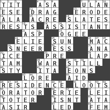 ACROSS 1. Teat (slang) 4. White ___ sheet 7. ____ Bator, Mongolia 11. Compass dir. 12. To draw with force 13. Eat (away) 14. Chicken ___ king 15. Measure of real estate 16. Chalkboards 17. Musical pauses 19. Helper 21. Viper 23. Double curve, resembling the letter S 24. Writer Wiesel 25. Player for Phoenix 26. Big _ 29. Scornful expression 30. Double-curved letter 31. Santa ___, CA 32. Frozen water 33. Before (prefix) 34. Pet locale 35. Scottish cap 36. Armed conflict 37. Not moving 40. Filthy place 41. Call ___ day 42. Immeasurably long periods of time 43. Old wives' tales, e.g. 45. Help 46. Dwelling 51. Plunders 55. Speaker 56. 4th largest of the Great Lakes 58. Luau accessory 59. Carrier 60. Is not 61. "One Day ___ Time" 62. SW Saudi Arabia district 63. Directed 64. Opposite of masc. DOWN 1. Separate forcefully 2. Small island 3. Afternoon social gatherings 4. Curve 5. "Two Mules for Sister ____" 6. Eras 7. A salt of uric acid 8. Globular water bottle used in Asia 9. An important port of Yemen 10. Egg locale 12. Small ungulate mammals of Africa 13. Otherwise 16. Public displays of written messages 18. Falsehood 20. Boozer 22. For each 24. Foe 25. Spanish missionary in California 26. Promenades 27. Of or related to the anus 28. Head covering 29. Jazz singing style 32. ___ a Wonderful Life 33. Eucharist need 36. One who wires 37. Ocean 38. Rest room 39. _ china 43. 61 cubic inches 44. Scent 46. Roll call or roster of names 47. Greek god of love 48. Suttee (variant) 49. To provide with a ceiling 50. Celtic language 52. Norwegian king 53. Wig 54. Thailand, formerly 57. Indiana (abbr.)