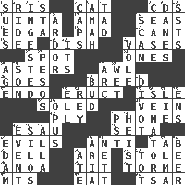 ACROSS 1. Indian titles of respect 5. Domesticated feline 8. Music discs 11. National forest in Provo, Utah 13. Nanny (var.) 14. Oceans 15. _ Allan Poe 16. Writing tablet 17. Patter 18. Perceive with the eye 19. Food container 21. Flower holders 22. Blemish 24. Washington bills 25. Michaelmas daisies 27. Leather borer 29. Leaves 30. A special lineage 32. Inside; within (prefix) 33. Spew [out] 35. Capri or Wright 39. Having a sole or soles 41. Distinctive style or manner 42. Travel a route regularly 43. Gives a jingle 45. He sold his birthright 48. Bristle 49. Vices 50. Opposed to 52. Keyboard key 55. Small valley 56. "We ___ not amused" (Victoria) 57. Fur scarf 59. Small Philippine buffalo 60. Teat (slang) 61. Singer Mel 62. Mountains (abbr.) 63. Ingest 64. Russian ruler of old DOWN 1. Takes to court 2. Travel on an animal 3. Swallowed 4. R.R. building 5. Balmoral and tarboosh 6. Wet nurse 7. Bit 8. Desist 9. Natives or inhabitants of Denmark 10. Fast planes 12. Zeal 14. Examine minutely or intensely 20. It is 21. Grand slam 23. Mexican monetary units 25. Ripen 26. Manchild 27. Curve 28. Soggy 30. Partially opened flower 31. A piece of turf (Scot.) 33. Pipe bend 34. Marina Del _, California 36. Elected representatives 37. Whopper 38. Followers of ems 40. Musical composition 43. Pacific Standard Time (abbr.) 44. Robbery 45. Happening 46. Grain storage towers 47. Silent film actress Nazimova 49. Dutch treat 50. Roberta Peters solo 51. Remaining after all deductions 53. _ mater 54. Fermented drink made from hops 56. Had dinner 58. Small child