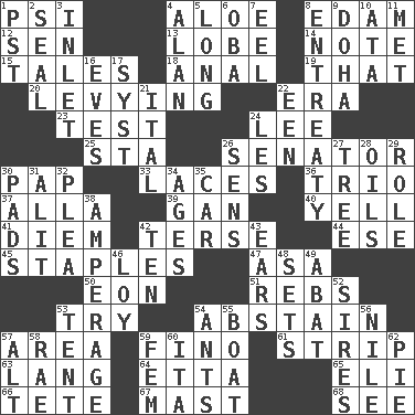 ACROSS 1. 23rd letter of the Greek alphabet 4. _ vera 8. Dutch treat 12. Elected rep. 13. Ear part 14. Brief written record 15. Lies 18. Of or related to the anus 19. Not this but _ 20. Imposing or collecting, as a tax 22. Epoch 23. Trial 24. Area sheltered from the wind 25. R.R. building 26. Elected representative 30. Infant food 33. Shoestrings 36. Musical group of three 37. Silent film actress Nazimova 39. Separate the seeds from cotton 40. Shout 41. South Vietnam president (1954) 42. Laconic 44. Compass dir. 45. Paper fasteners 47. White ___ sheet 50. Age 51. Confederate soldiers (slang) 53. Attempt 54. Choose not to consume 57. Type of rug 59. A pale, very dry sherry 61. Remove all contents or possession from 63. Long (Scottish) 64. Singer James 65. Connecticut Ivy Leaguer 66. False hair 67. Vertical spar for supporting sails 68. Perceive with the eye DOWN 1. Pacific Standard Time (abbr.) 2. Lick closed 3. An arm off of a larger body of water 4. ____ Jay Lerner 5. Having great length 6. Chief or king in Benin or Nigeria 7. Snakelike fish 8. Plea 9. Capital of the state of Qatar 10. _ moment's notice (2 wds.) 11. Was introduced to 16. Nights before holidays 17. System (abbr.) 21. Slanted text style (abbr.) 22. Car or cant ending 24. French article 26. Elected reps. 27. Relationship diagram 28. Petroleums 29. Hero or heavy, e.g. 30. Writing tablets 31. Set down 32. Entreaty 34. Matures 35. Auto 38. Electrical Measurement 42. "___ Little Indians" 43. Hearing organs 46. Myrna of the movies 48. Puts into a specified state 49. Blind as ____ 52. Titles for men of rank and authority 53. Portable shelter 54. Pismires 55. Water vessel 56. The longest river in the world 57. Keyboard modifier key 58. Actress Charlotte 59. Opposite of masc. 60. Call ___ day 62. Sliced dessert