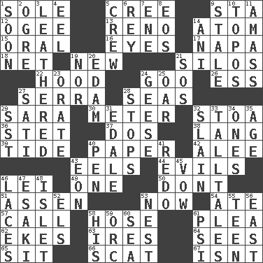 ACROSS 1. Flatfish 5. Algonquian 9. R.R. building 12. Double curve, resembling the letter S 13. Western Nevada city 14. Smallest unit of an element 15. Of the mouth 16. Sight organs 17. California wine valley 18. Fish or hair follower 19. ___ Haven, CT 21. Grain storage towers 22. Parka part 24. Thick or sticky substance 26. Curvy letter 27. Father Junipero _ 28. Oceans 29. "Two Mules for Sister ____" 30. Distance measurement 32. Portico 36. Proofreading order 37. Two (Sp.) 38. Long (Scottish) 39. Periodic rise and fall of the sea level 40. Some stationery 42. Toward shelter 43. Snakelike fish 44. Vices 46. Flowery wreath 49. Single 50. Do not 51. NE Netherlands city 53. At this time 54. Had dinner 57. Give a ring to 58. Stockings 61. Entreaty 62. Makes supply last 63. Angers 64. Perceives with the eye 65. Be seated 66. Scram! 67. Is not DOWN 1. Within a short period 2. Legendary monster 3. Resembling or made to resemble leather 4. Snakelike fish 5. Group working together 6. Marina Del _, California 7. Compass dir. 8. Greek goddess of the dawn 9. Lacking originality or spontaneity 10. Literary convention 11. Collect or gather 14. Cuckoo 19. Or not 20. Dutch treat 21. Mayday 23. Declaim 24. Honkers 25. Rowing implement 27. Suttee (variant) 28. Constricts 29. Fast jet (abbr.) 31. Peak District village in England 32. Killed 33. Baron Munchausen's specialties 34. Washington bills 35. Personal question 40. Fenced enclosure 41. Redecorate 43. Period of immesurable duration 45. Solemn pledge 46. Shoestrings 47. 1973 Nobel Price Winner (Physics) Leo 48. Small island 52. Raised railways 53. Egg locale 55. Adolescent 56. 90 degrees 58. Part of HMS, perhaps 59. The grampus (Milton) 60. Ocean 61. Air pressure measure (abbr.)