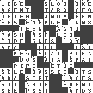 ACROSS 1. Ear part 5. Oscar Madison type 9. D.D.E's nickname 12. Rep 14. Edible starchy tuberous root 15. Corporate head (abbr.) 16. Prevent from occurring 17. Actor Griffith 18. Car or cant ending 19. Consenting reply 20. Develop 23. Restaurants 24. Adolescent 25. Hindu god of fire 27. Romantic infatuation 30. Science/research agcy. 32. Directed 33. Event that recurs at intervals 34. Takes to court 36. Myrna of the movies 38. Nanny (var.) 39. Pipe bend 40. Eastern Standard Time (abbr.) 43. Barrel 46. Narrow board 48. Entreaty 49. Two (Sp.) 51. "One Day ___ Time" 52. Petty quarrel 53. Corncob 54. Needle case 56. Flatfish 58. Small ungulate mammals of Africa 61. ___ a Wonderful Life 64. Alias (abbr.) 65. Back-to-school mo. 66. Shoestrings 68. Be seated 69. Johnson of "Laugh-In" 70. Incident 71. Observe 72. Inconspicuous attention getter 73. Does sums DOWN 1. Kenny Rogers chart-topper in '80 2. Double curve, resembling the letter S 3. Stakes 4. Compass dir. 5. Play the lead 6. Austrian-born American filmmaker Fritz 7. Severe or trying experience 8. Male child 9. Ancient Celtic tribe of eastern Britain 10. Peachy ____! 11. Immeasurably long periods of time 13. Woody plant 21. Not women's 22. Follows as a consequence or result 23. Southeast Asian peninsula 24. Definite Article 26. Set 27. Parent Teacher Assoc. 28. Direct toward a target or goal 29. Neighbor of Neb. 31. Man or boy (slang) 35. Chalkboards 37. Sharp bark 41. Ocean 42. Make lace 44. Singer Brickell 45. Grand Old Party 47. Jacques of French films 48. 23rd letter of the Greek alphabet 50. Spring feasts 53. Food holder 55. Ubangi River tributary 56. Backtalk 57. Migrant worker of the '30s 59. Flats, for short 60. Proofreading order 61. On the rocks 62. Look after 63. Fast planes 65. Plant excrement 67. Actress Gardner